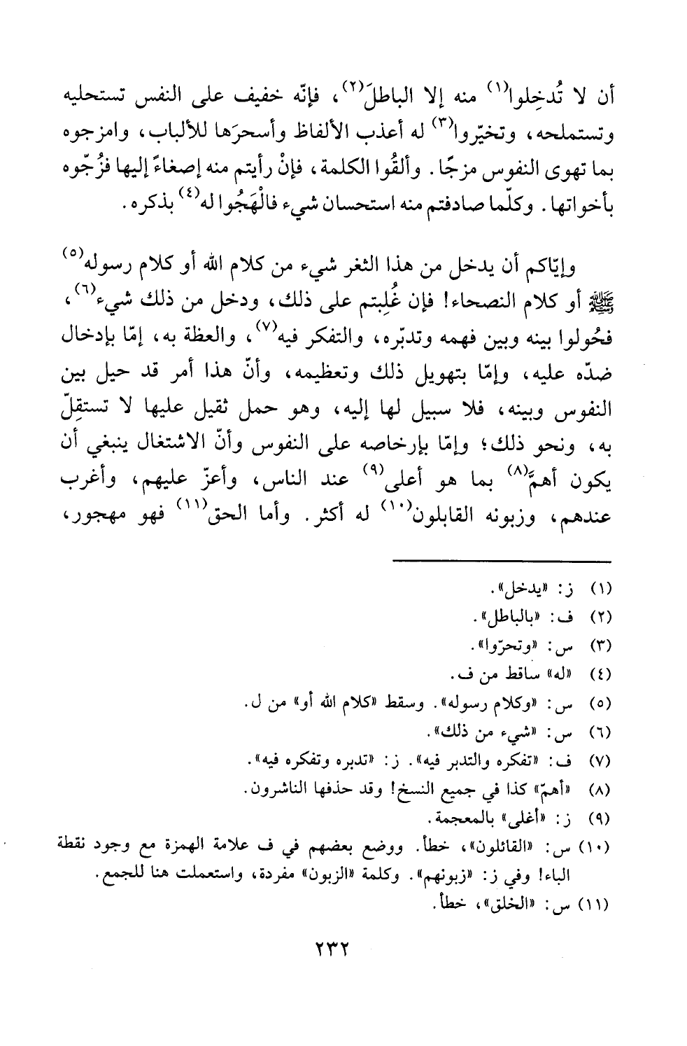 أن لا تُدخِلوا (¬1) منه إلا الباطلَ (¬2)، فإنّه خفيف على النفس تستحليه وتستملحه، وتخيّروا (¬3) له أعذب الألفاظ وأسحرَها للألباب، وامزجوه بما تهوى النفوس مزجًا. وألقُوا الكلمة، فإنْ رأيتم منه إصغاءً إليها فزُجّوه بأخواتها. وكلّما صادفتم منه استحسان شيء فالْهَجُوا له (¬4) بذكره.