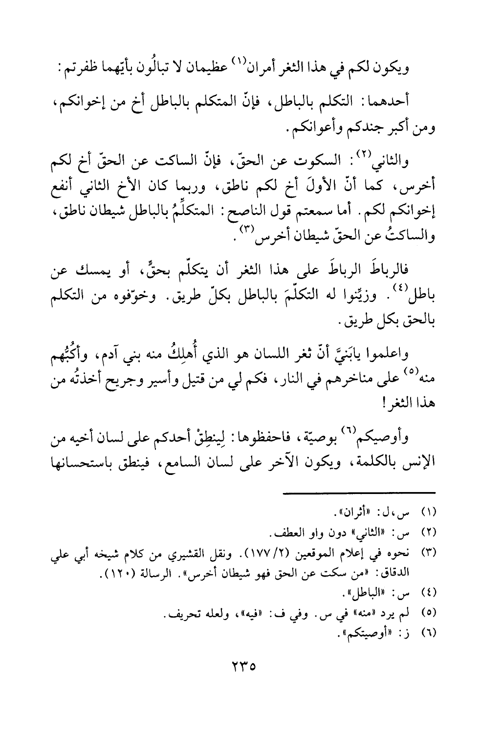فالرباطَ الرباطَ على هذا الثغر أن يتكلّم بحق، أو يمسك عن باطل (¬4). وزيّنوا له التكلّمَ بالباطل بكلّ طريق. وخوّفوه من التكلم بالحق بكل طريق.