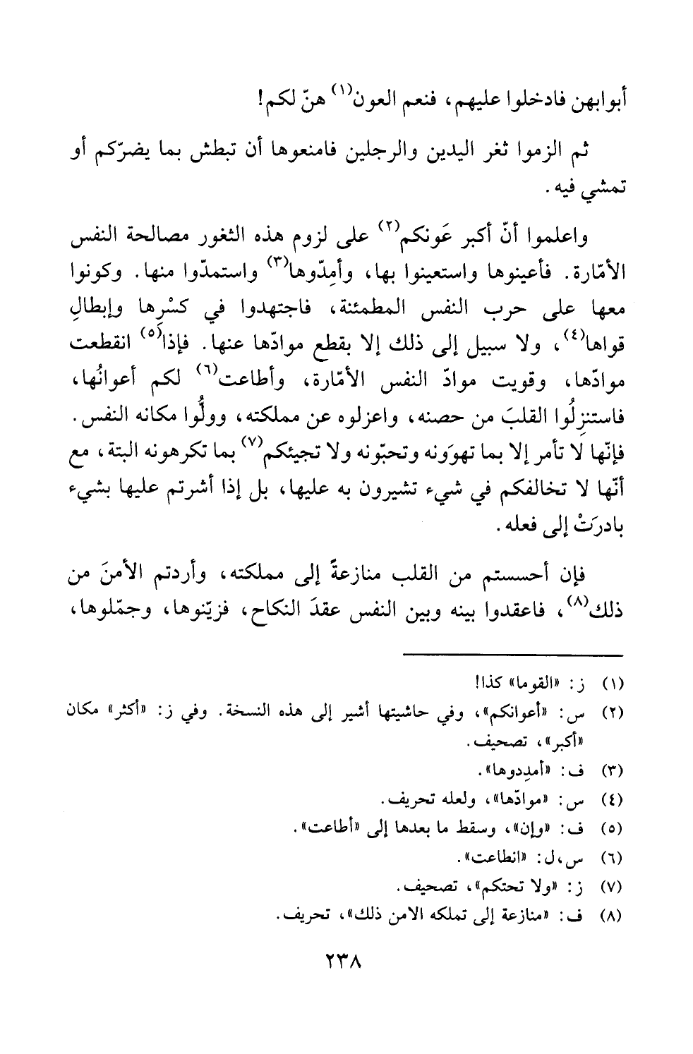 واعلموا أنّ أكبر عَونكم (¬2) على لزوم هذه الثغور مصالحة النفس الأمّارة. فأعينوها واستعينوا بها، وأمِدّوها (¬3) واستمدّوا منها. وكونوا معها على حرب النفس المطمئنة، فاجتهدوا في كسْرها وإبطالِ