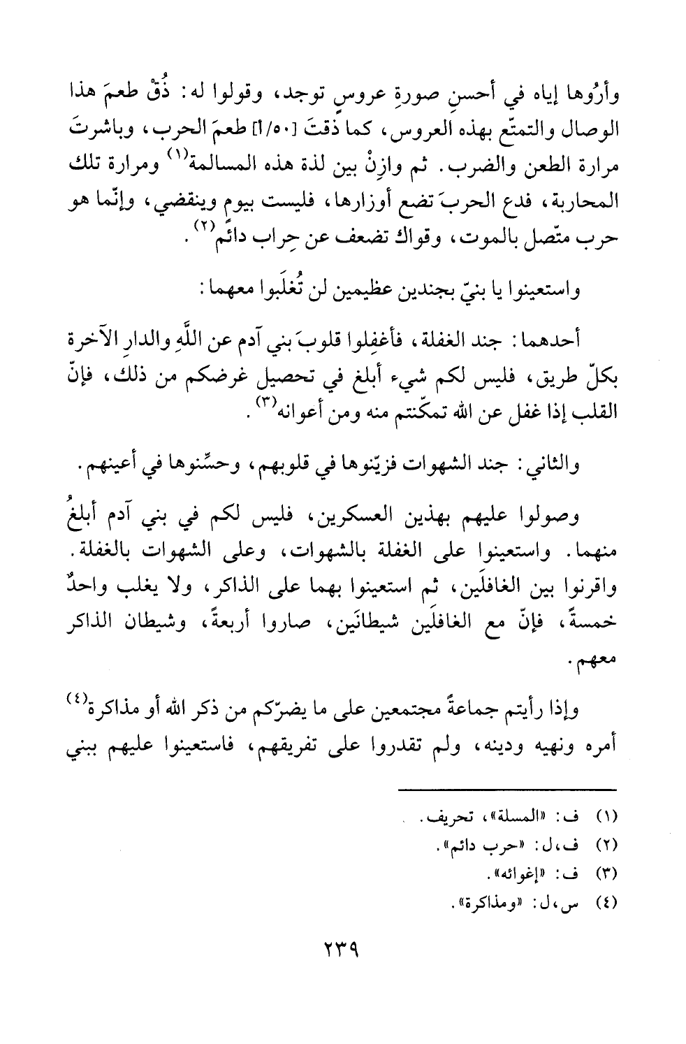 وصولوا عليهم بهذين العسكرين، فليس لكم في بني آدم أبلغُ منهما. واستعينوا على الغفلة بالشهوات، وعلى الشهوات بالغفلة، واقرنوا بين الغافلَين، ثم استعينوا بهما على الذاكر، ولا يغلب واحدٌ خمسةً، فإنّ مع الغافلَين شيطانَين، صاروا أربعةً، وشيطان الذاكر معهم.