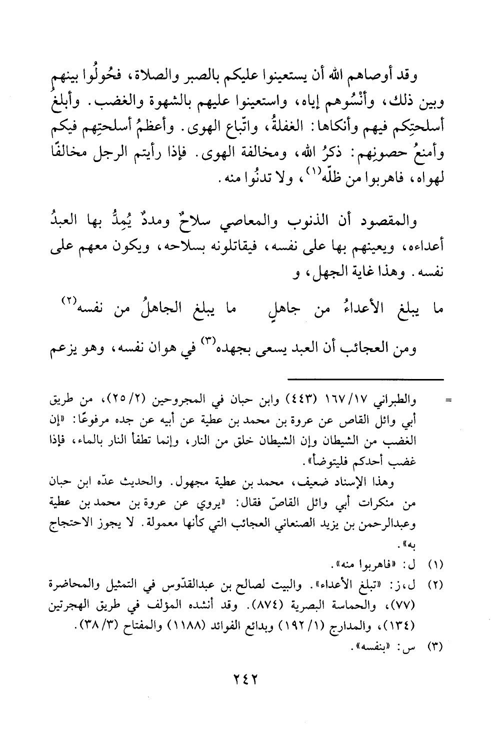وقد أوصاهم الله أن يستعينوا عليكم بالصبر والصلاة، فحُولُوا بينهم وبيّن ذلك، وأنْسُوهم إياه، واستعينوا عليهم بالشهوة والغضب. وأبلغ أسلحتِكم فيهم وأنكاها: الغفلةُ، واتّباع الهوى. وأعظمُ أسلحتِهم فيكم وأمنعُ حصونهم: ذكرُ الله، ومخالفة الهوى. فإذا رأيتم الرجل مخالفَا لهواه، فاهربوا من ظله (¬1)، ولا تدنُوا منه.
