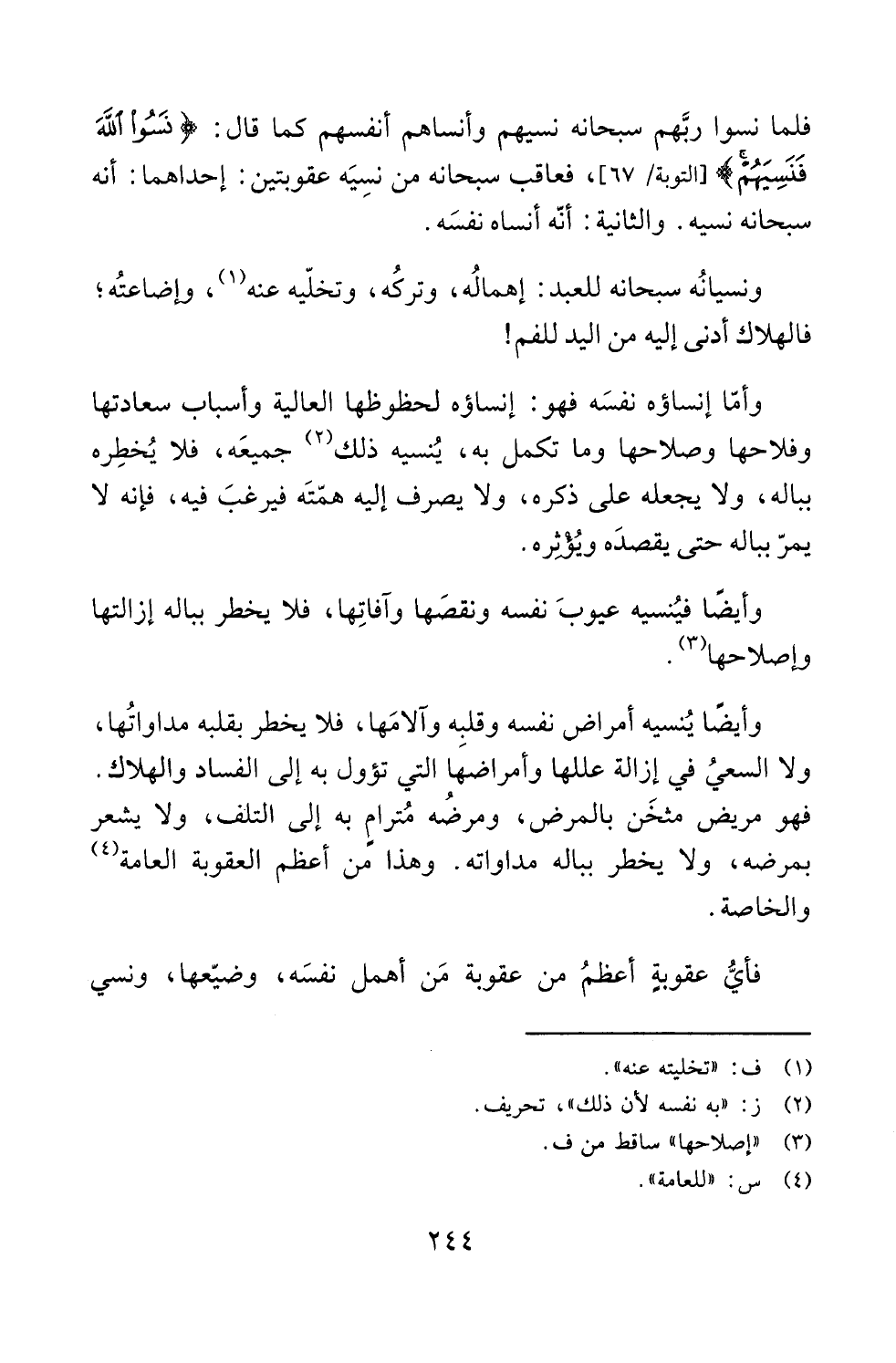 وأما إنساؤه نفسَه فهو: إنساؤه لحظوظها العالية وأسباب سعادتها وفلاحها وصلاحها وما تكمل به، يُنسيه ذلك (¬2) جميعَه، فلا يُخطِره بباله، ولا يجعله على ذكره، ولا يصرف إليه همّتَه فيرغبَ فيه، فإنه لا يمرّ بباله حتى يقصدَه ويُؤثِره.