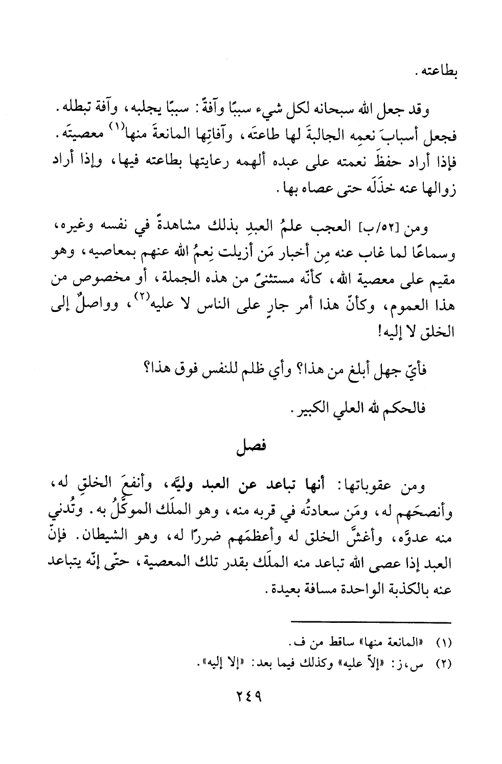 فجعل أسبابَ نعمِه الجالبةَ لها طاعتَه، وآفاتِها المانعةَ منها (¬1) معصيتَه.