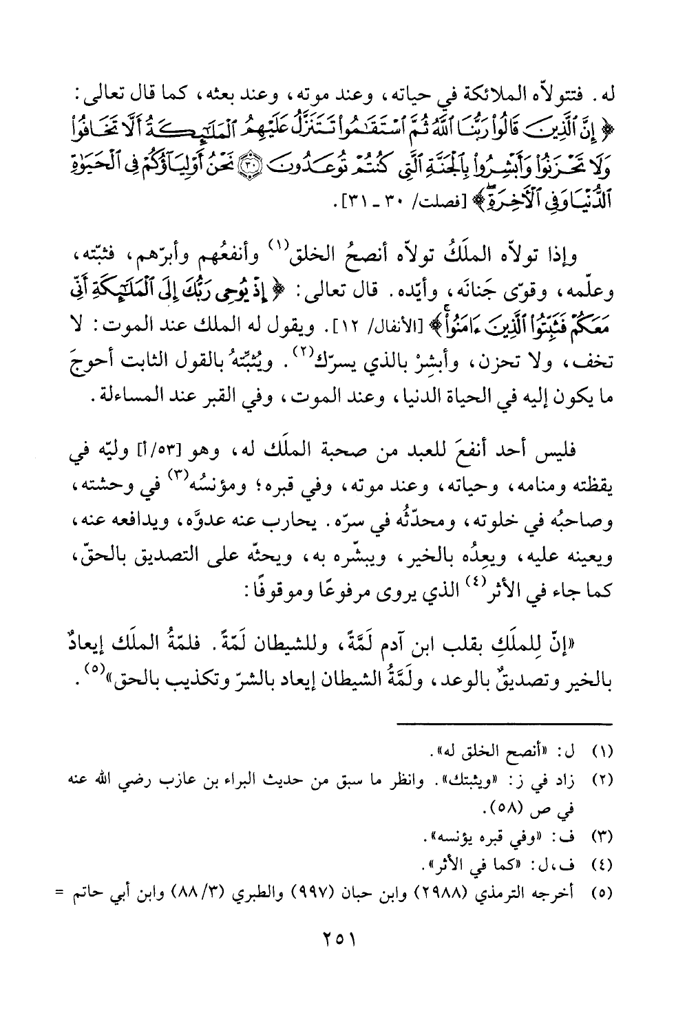 فليس أحد أنفعَ للعبد من صحبة الملَك له، وهو [53/ أ] وليّه في يقظته ومنامه، وحياته، وعند موته، وفي قبره، ومؤنسُه (¬3) في وحشته، وصاحبُه في خلوته، ومحدّثُه في سرّه. يحارب عنه عدوَّه، ويدافعه عنه، ويعينه عليه، ويعِدُه بالخير، ويبشّره به، ويحثّه على التصديق بالحقّ، كما جاء في الأثر (¬4) الذي يروى مرفوعًا وموقوفًا: "إنّ لِلملَكِ بقلب ابن آدم لَمَّةً، وللشيطان لَمّةً. فلمّةُ الملَك إيعادٌ بالخير وتصديقٌ بالوعد، ولَمَّةُ الشيطان إيعاد بالشرّ وتكذيب بالحق" (¬5).
