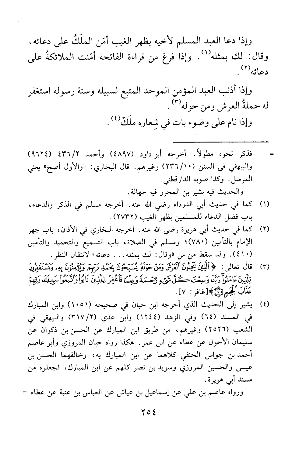 وإذا دعا العبد المسلم لأخيه بظهر الغيب أمّن الملَكُ على دعائه، وقال: لك بمثله (¬1). وإذا فرغ من قراءة الفاتحة أمّنت الملائكةُ على دعائه (¬2).