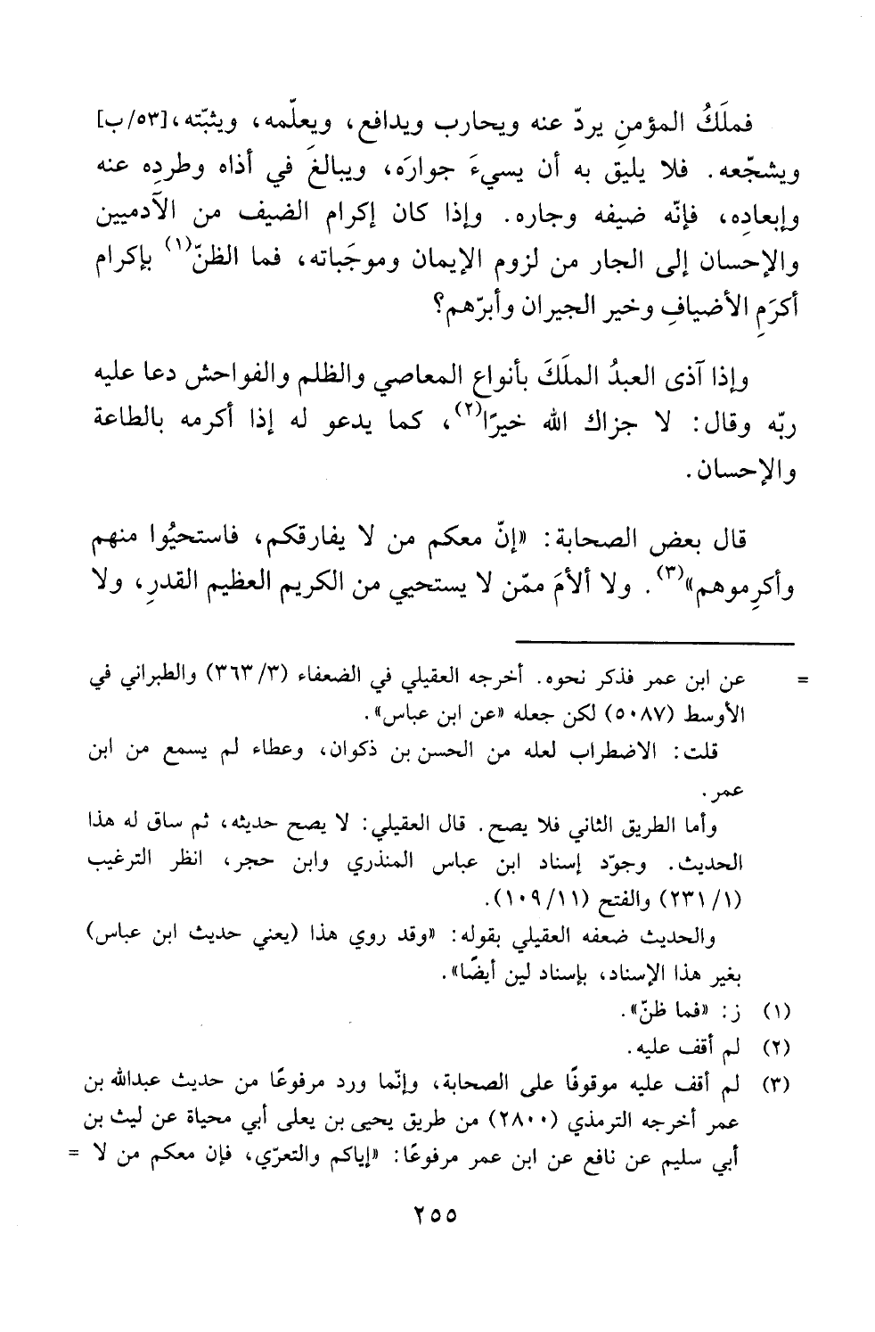 فملَكُ المؤمنِ يردّ عنه ويحارب ويدافع، ويعلّمه، ويثبّته، [53/ ب] ويشجّعه. فلا يليق به أن يسيءَ جوارَه، ويبالغَ في أذاه وطردِه عنه وإبعادِه، فإنّه ضيفه وجاره. وإذا كان إكرام الضيف من الآدميين