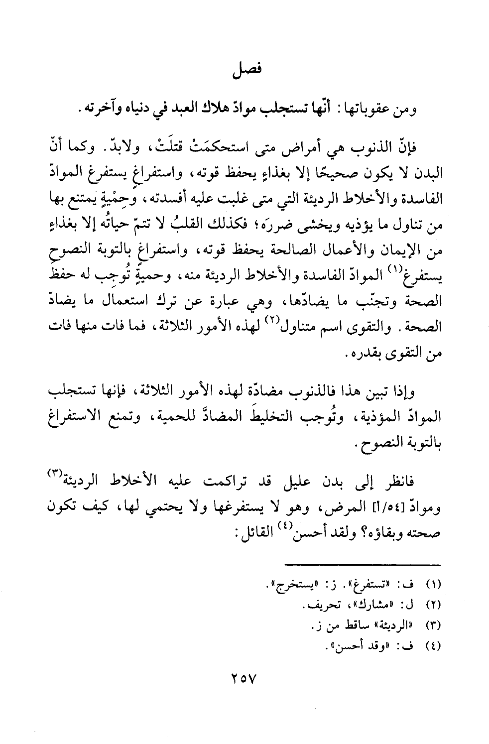 فإنّ الذنوب هي أمراض متى استحَكمَتْ قتلَتْ، ولابدّ. وكما أنّ البدن لا يكون صحيحًا إلا بغذاءٍ يحفظ قوته، واستفرغ يستفرغ الموادّ الفاسدة والأخلاط الرديئة التي متى غلبت عليه أفسدته، وحِميةٍ يمتنع بها من تناول ما يؤذيه ويخشى ضررَه؛ فكذلك القلبُ لا تتمّ حياتُه إلا بغذاءٍ من الإيمان والأعمال الصالحة يحفظ قوته، واستفرغ بالتوبة النصوح يستفرغ (¬1) الموادّ الفاسدة والأخلاط الرديئة منه، وحميةٍ تُوجب له حفظ الصحة وتجنّب ما يضادها، وهي عبارة عن ترك استعماَل ما يضادّ الصحة. والتقوى اسم متناول (¬2) لهذه إلاَّمور الثلاثة، فما فات منها فات من التقوى بقدره.
