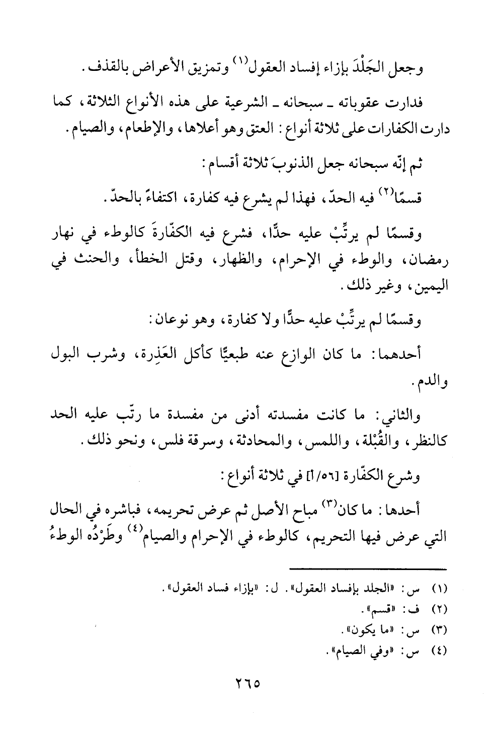 وقسمًا لم يرتِّبْ عليه حدًّا، فشرع فيه الكفّارةَ كالوطء في نهار رمضان، والوطء في الإحرام، والظهار، وقتل الخطأ، والحنث في اليمين، وغير ذلك.