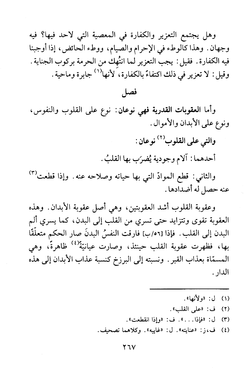 وعقوبة القلوب أشد العقوبتين، وهي أصل عقوبة الأبدان. وهذه العقوبة تقوى وتتزايد حتى تسري من القلب إلى البدن، كما يسري ألم البدن إلى القلب. فإذا [56/ ب] فارقت النفسُ البدنَ صار الحكم متعلّقًا بها، فظهرت عقوبة القلب حينئذ، وصارت عيانيّة (¬4) ظاهرةً، وهي المسمّاة بعذاب القبر. ونسبته إلى البرزخ كنسبة عذاب الأبدان إلى هذه الدار.