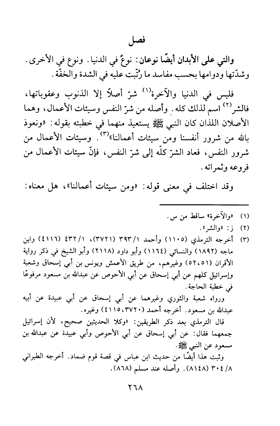 فليس في الدنيا والآخرة (¬1) شرّ أصلًا إلا الذنوب وعقوباتها، فالشر (¬2) اسم لذلك كله. وأصله من شرّ النفس وسيئات الأعمال، وهما الأصلان اللذان كان النبي - صلى الله عليه وسلم - يستعيذ منهما في خطبته بقوله: "ونعوذ بالله من شرور أنفسنا ومن سيئات أعمالنا" (¬3). وسيئات الأعمال من