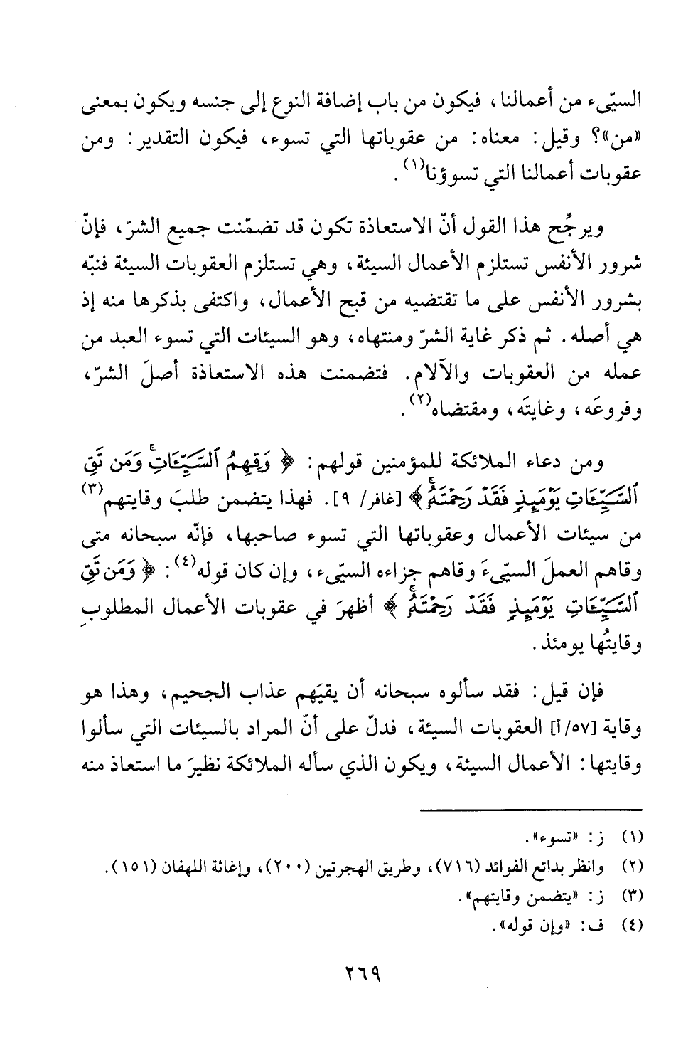 ويرجِّح هذا القول أنّ الاستعاذة تكون قد تضمّنت جميع الشرّ، فإنّ شرور الأنفس تستلزم الأعمال السيئة، وهي تستلزم العقوبات السيئة فنبّه بشرور الأنفس على ما تقتضيه من قبح الأعمال، واكتفى بذكرها منه إذ هي أصله. ثم ذكر غاية الشرّ ومنتهاه، وهو السيئات التي تسوء العبد من عمله من العقوبات والآلام. فتضمنت هذه الاستعاذة أصلَ الشرِّ، وفروعَه، وغايتَه، ومقتضاه (¬2).