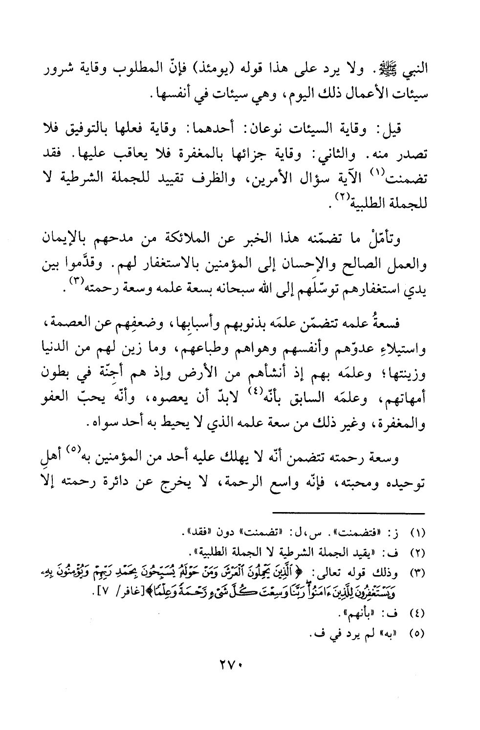 وتأمّل ما تضمّنه هذا الخبر عن الملائكة من مدحهم بالإيمان والعمل الصالح والإحسان إلى المؤمنين بالاستغفار لهم. وقدَّموا بين يدي استغفارهم توسّلَهم إلى الله سبحانه بسعة علمه وسعة رحمته (¬3).