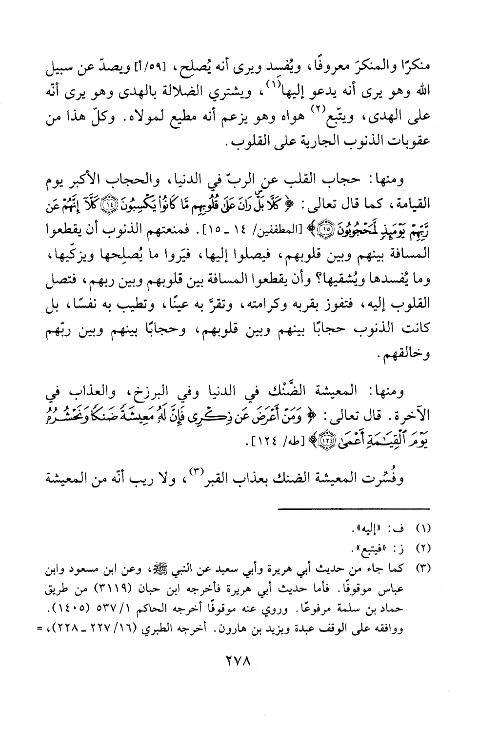 ومنها: حجاب القلب عن الربّ في الدنيا، والحجاب الأكبر يوم القيامة، كما قال تعالى: {كَلَّا بَلْ رَانَ عَلَى قُلُوبِهِمْ مَا كَانُوا يَكْسِبُونَ (14) كَلَّا إِنَّهُمْ عَنْ رَبِّهِمْ يَوْمَئِذٍ لَمَحْجُوبُونَ (15)} [المطففين: 14 - 15]. فمنعتهم الذنوب أن يقطعوا المسافة بينهم وبيّن قلوبهم، فيصلوا إليها، فيَروا ما يُصلِحها ويزكّيها، وما يُفسدها ويُشقيها؟ وأن يقطعوا المسافة بين قلوبهم وبيّن ربهم، فتصل القلوب إليه، فتفوز بقربه وكرامته، وتقرَّ به عينًا، وتطيب به نفسًا، بل كانت الذنوب حجابًا بينهم وبيّن قلوبهم، وحجابًا بينهم وبيّن ربّهم وخالقهم.