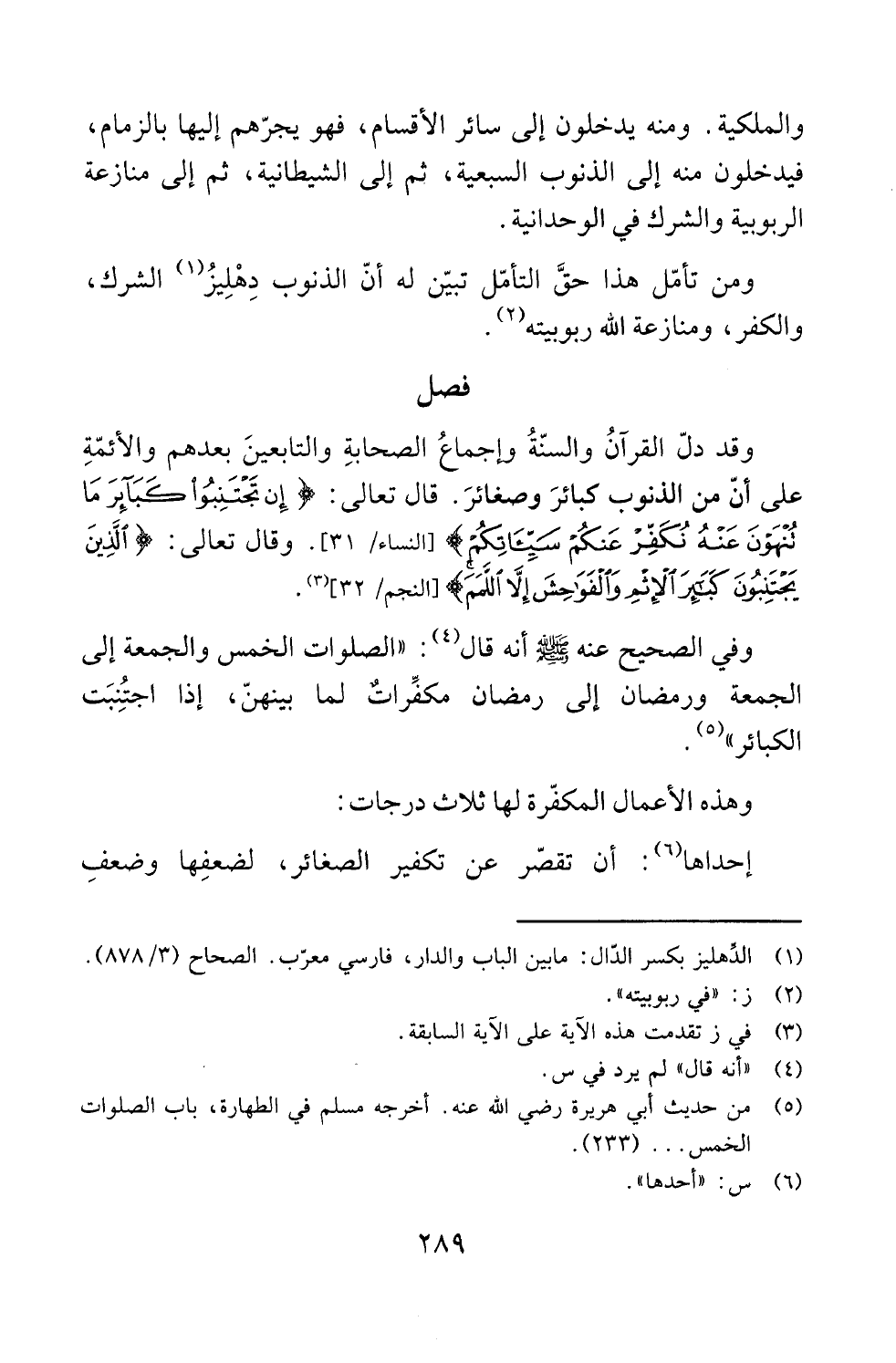 وقد دلّ القرآنُ والسنّةُ وإجماعُ الصحابةِ والتابعينَ بعدهم والأئمّةِ على أنّ من الذنوب كبائرَ وصغائرَ. قال تعالى: {إِنْ تَجْتَنِبُوا كَبَائِرَ مَا تُنْهَوْنَ عَنْهُ نُكَفِّرْ عَنْكُمْ سَيِّئَاتِكُمْ} [النساء: 31]. وقال تعالى: ({الَّذِينَ يَجْتَنِبُونَ كَبَائِرَ الْإِثْمِ وَالْفَوَاحِشَ إِلَّا اللَّمَمَ} [النجم: 32] (¬3).