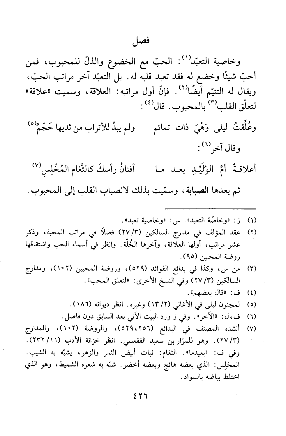 (¬2) عقد المؤلف في مدارج السالكين (3/ 27) فصلًا في مراتب المحبة، وذكر عشر مراتب، أولها العلاقة، وآخرها الخُلّة. وانظر في أسماء الحب واشتقاقها روضة المحبين (95).