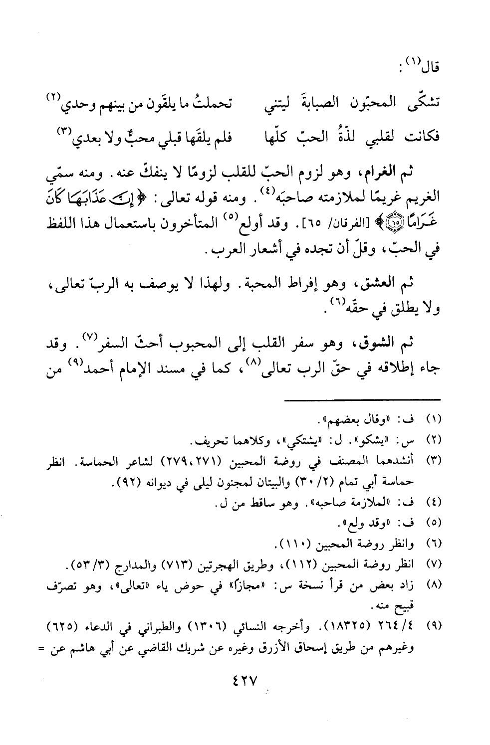 (¬7) انظر روضة المحبين (112)، وطريق الهجرتين (713) والمدارج (3/ 53).