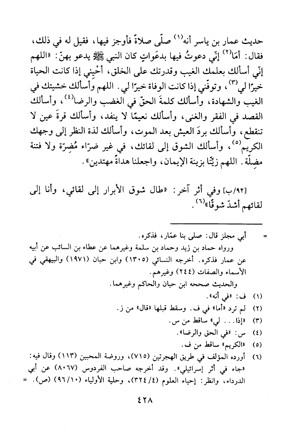 حديث عمار بن ياسر أنه (¬1) صلّى صلاةً فأوجز فيها، فقيل له في ذلك، فقال: أمَا (¬2) إنّي دعوتُ فيها بدعَواتٍ كان النبي - صلى الله عليه وسلم - يدعو بهنّ: "اللهم إنّي أسألك بعلمك الغيب وقدرتك على الخلق، أحْيني إذا كانت الحياة خيرًا لي (¬3)، وتوفّني إذا كانت الوفاة خيرًا لي. اللهم وَأسالك خشيتك في الغيب والشهادة، وأسألك كلمةَ الحقّ في الغضب والرضا (¬4)، وأسألك