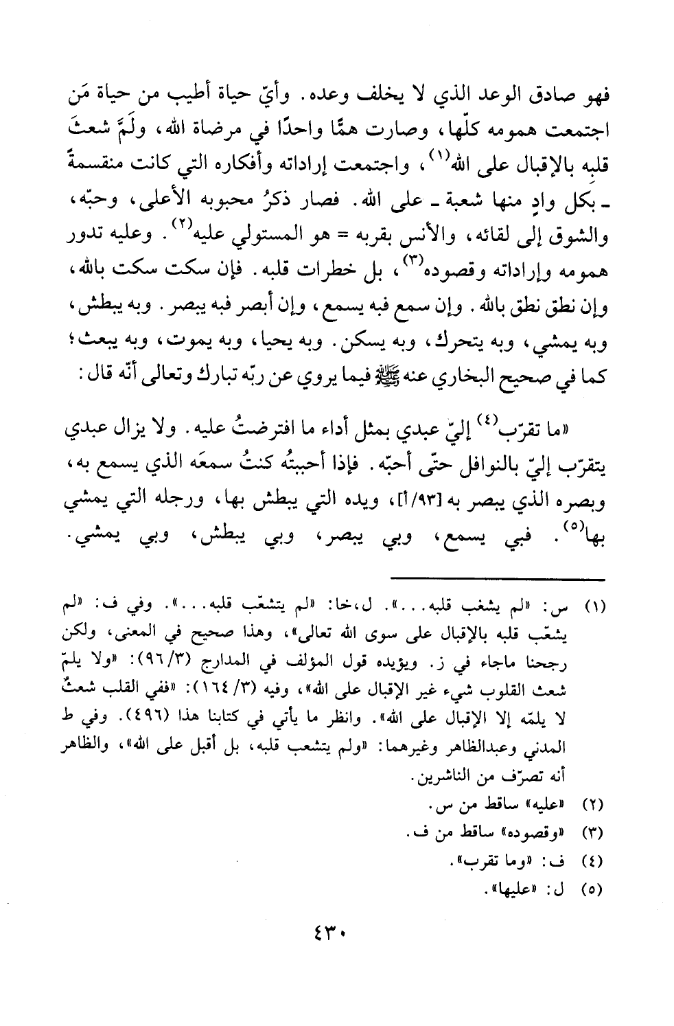 "ما تقرّب (¬4) إليّ عبدي بمثل أداء ما افترضتُ عليه. ولا يزال عبدي يتقرّب إلي بالنوافل حتّى أحبّه. فإذا أحببتُه كنتُ سمعَه الذي يسمع به، وبصره الذي يبصر به [93/ أ]، ويده التي يبطش بها، ورجله التي يمشي بها (¬5). فبي يسمع، وبي يبصر، وبي يبطش، وبي يمشي.