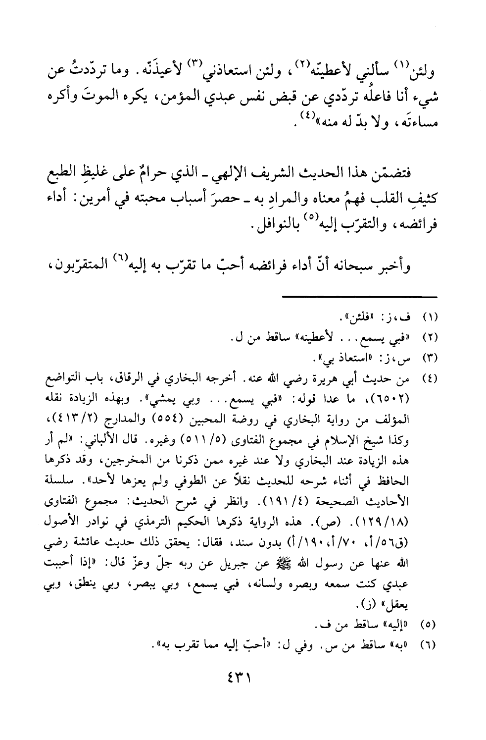 (¬4) من حديث أبي هريرة رضي الله عنه. أخرجه البخاري في الرقاق، باب التواضع (6502)، ما عدا قوله: "فبي يسمع ... وبي يمشي". وبهذه الزيادة نقله المؤلف من رواية البخاري في روضة المحبين (554) والمدارج (2/ 413)، وكذا شيخ الإسلام في مجموع الفتاوى (5/ 511) وغيره. قال الألباني: "لم أر هذه الزيادة عند البخاري ولا عند غيره ممن ذكرنا من المخرجين، وقد ذكرها الحافظ في أثناء شرحه للحديث نقلاَ عن الطوفي ولم يعزها لأحد". سلسلة الأحاديث الصحيحة (4/ 191). وانظر في شرح الحديث: مجموع الفتاوى (18/ 129). (ص). هذه الرواية ذكرها الحكيم الترمذي في نوادر الأصول (ق 56/ أ، 70/ أ، 190/ أ) بدون سند، فقال: يحقق ذلك حديث عائشة رضي