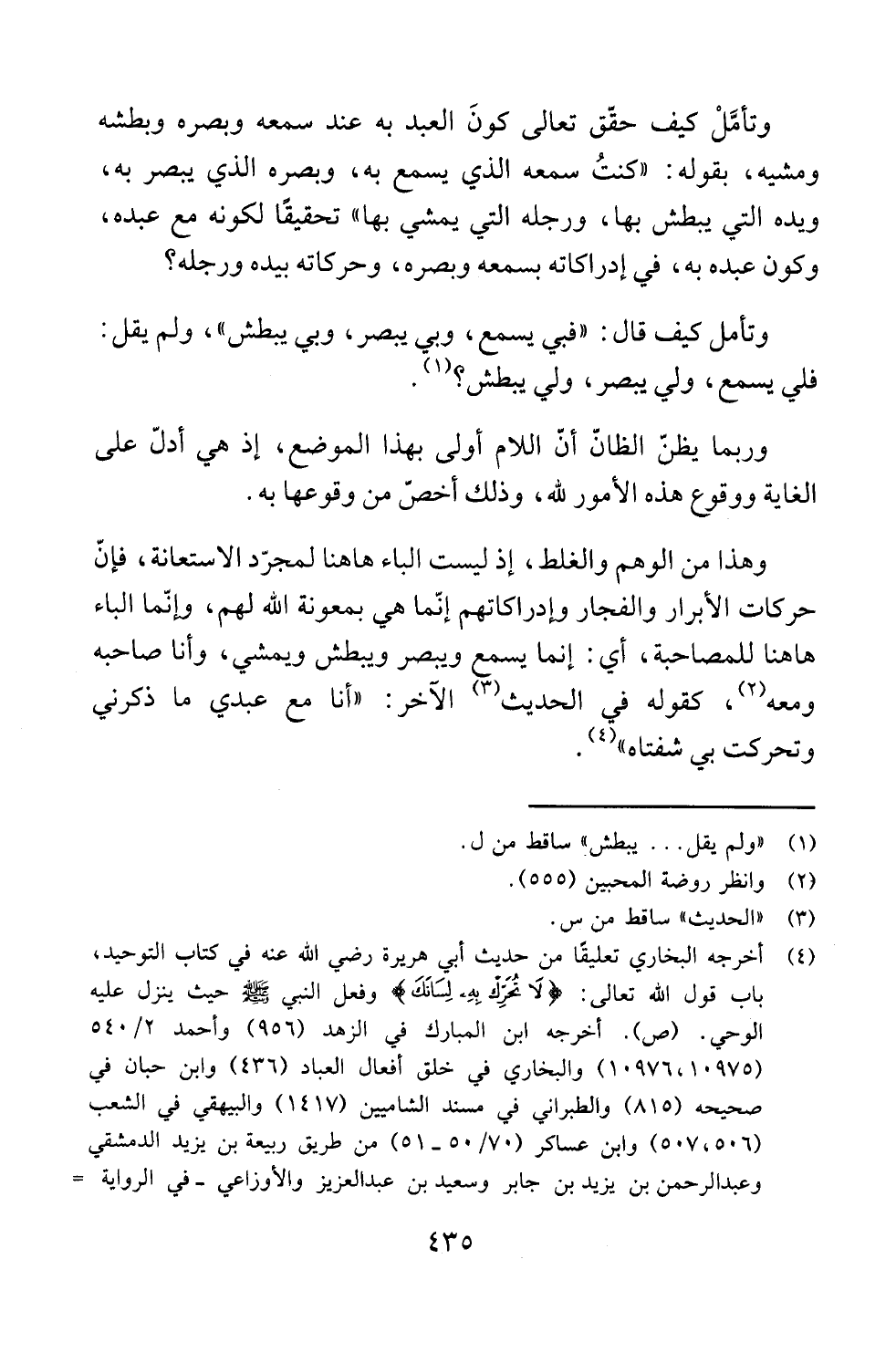 وتأمَّلْ كيف حقّق تعالى كونَ العبد به عند سمعه وبصره وبطشه ومشيه، بقوله: "كنتُ سمعه الذي يسمع به، وبصره الذي يبصر به، ويده التي يبطش بها، ورجله التي يمشي بها" تحقيقًا لكونه مع عبده،