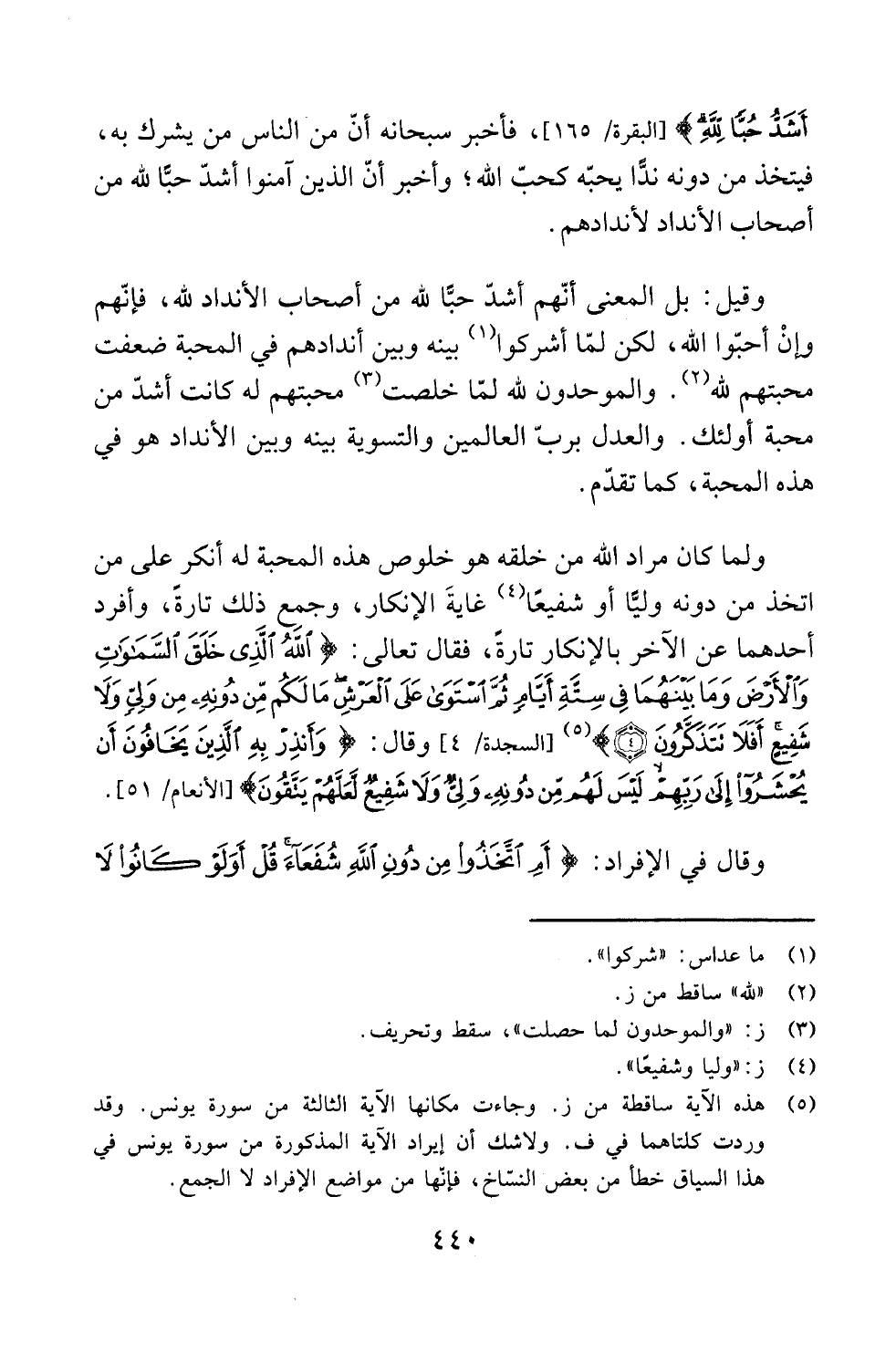 (¬5) هذه الآية ساقطة من ز. وجاءت مكانها الآية الثالثة من سورة يونس. وقد وردت كلتاهما في ف. ولاشك أن إيراد الآية المذكورة من سورة يونس في هذا السياق خطا من بعض النساخ، فإئها من مواضع الإفراد لا الجمع.