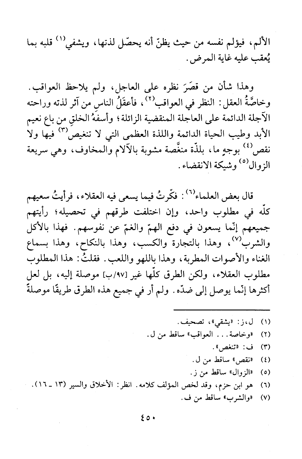 (¬6) هو ابن حزم، وقد لخص المؤلف كلامه. انظر: الأخلاق والسير (13 - 16).