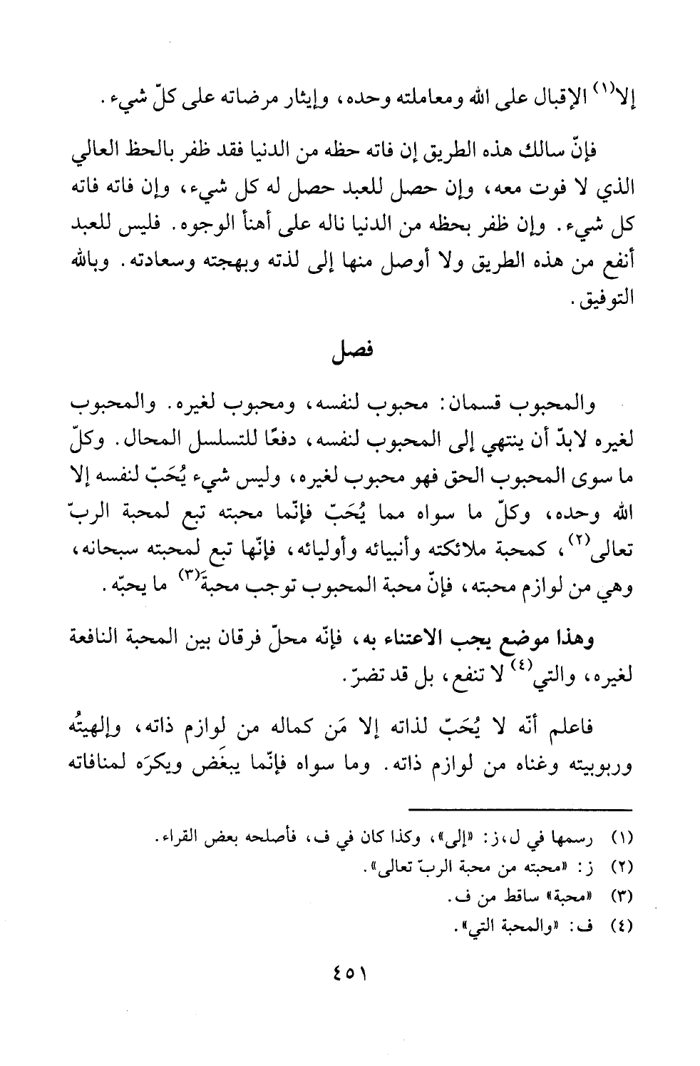 والمحبوب قسمان: محبوب لنفسه، ومحبوب لغيره. والمحبوب لغيره لابدّ أن ينتهي إلى المحبوب لنفسه، دفعًا للتسلسل المحال. وكلّ ما سوى المحبوب الحق فهو محبوب لغيره، وليس شيء يُحَبّ لنفسه إلا