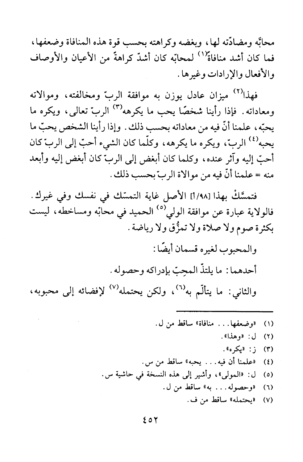 فهذا (¬2) ميزان عادل يوزن به موافقة الربّ ومخالفته، وموالاته ومعاداته. فإذا رأينا شخصًا يحب ما يكرهه (¬3) الربّ تعالى، ويكره ما يحبّه، علمنا أنّ فيه من معاداته بحسب ذلك. وإذا رأينا الشخص يحبّ ما يحبه (¬4) الربّ، ويكره ما يكرهه، وكلّما كان الشيء أحبّ إلى الربّ كان أحبّ إليه وآثر عنده، وكلما كان أبغض إلى الربّ كان أبغض إليه وأبعد منه = علمنا أنّ فيه من موالاة الربّ بحسب ذلك.