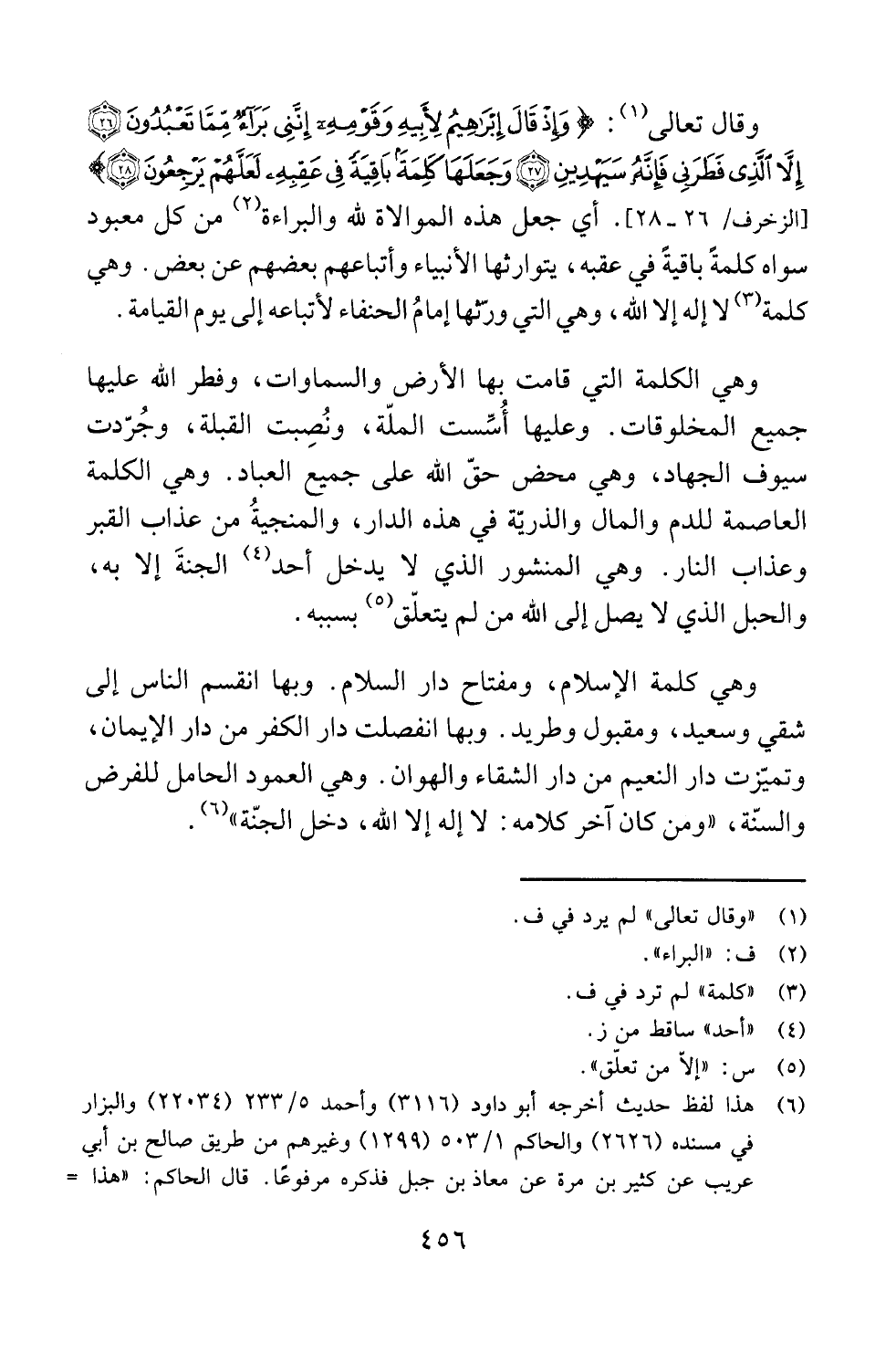 وهي الكلمة التي قامت بها الأرض والسماوات، وفطر الله عليها جميع المخلوقات. وعليها أُسِّست الملّة، ونُصِبت القبلة، وجُرّدت سيوف الجهاد، وهي محض حقّ الله على جميع العباد. وهي الكلمة
