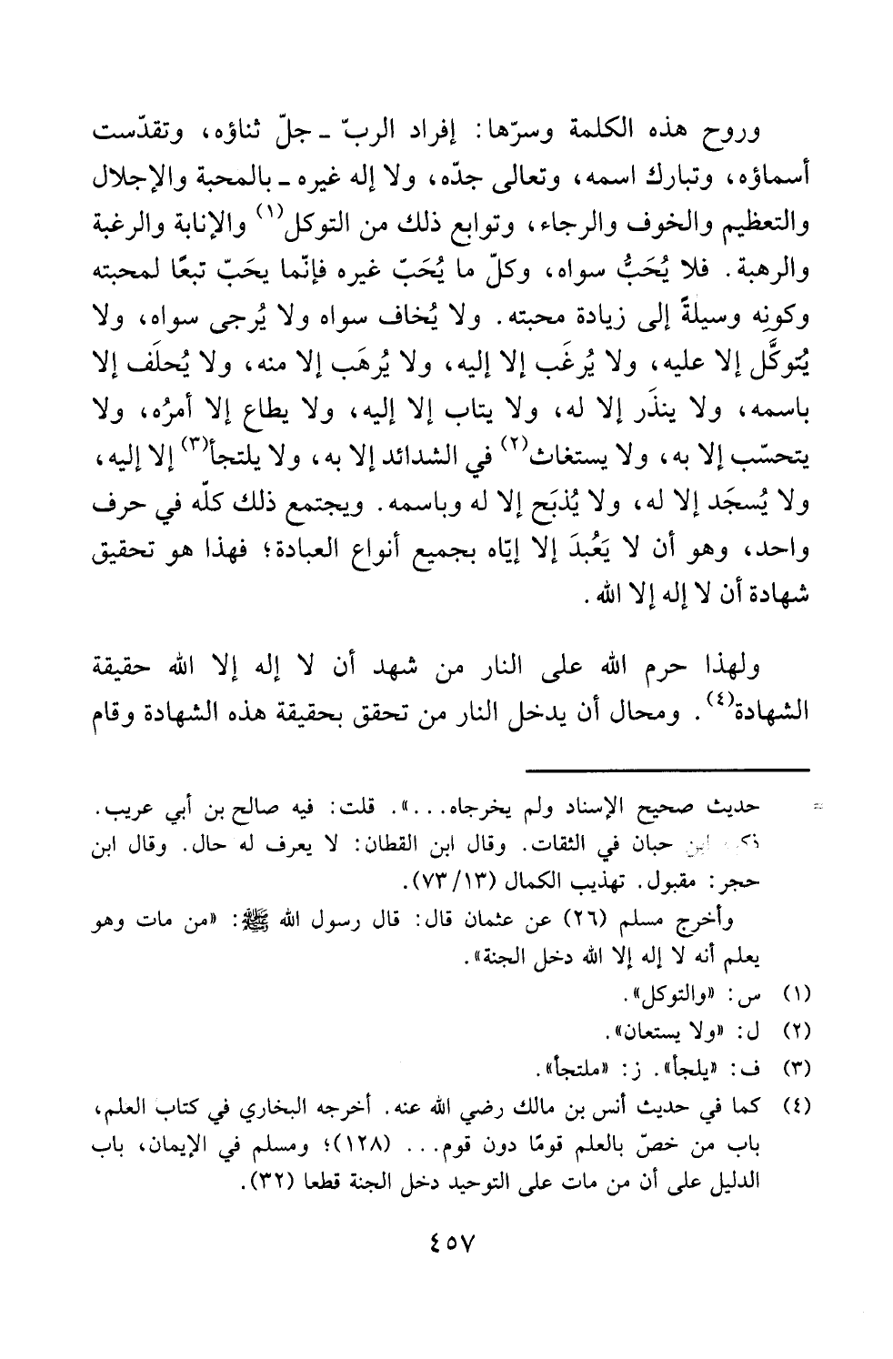 ولهذا حرم الله على النار من شهد أن لا إله إلا الله حقيقة الشهادة (¬4). ومحال أن يدخل النار من تحقق بحقيقة هذه الشهادة وقام
