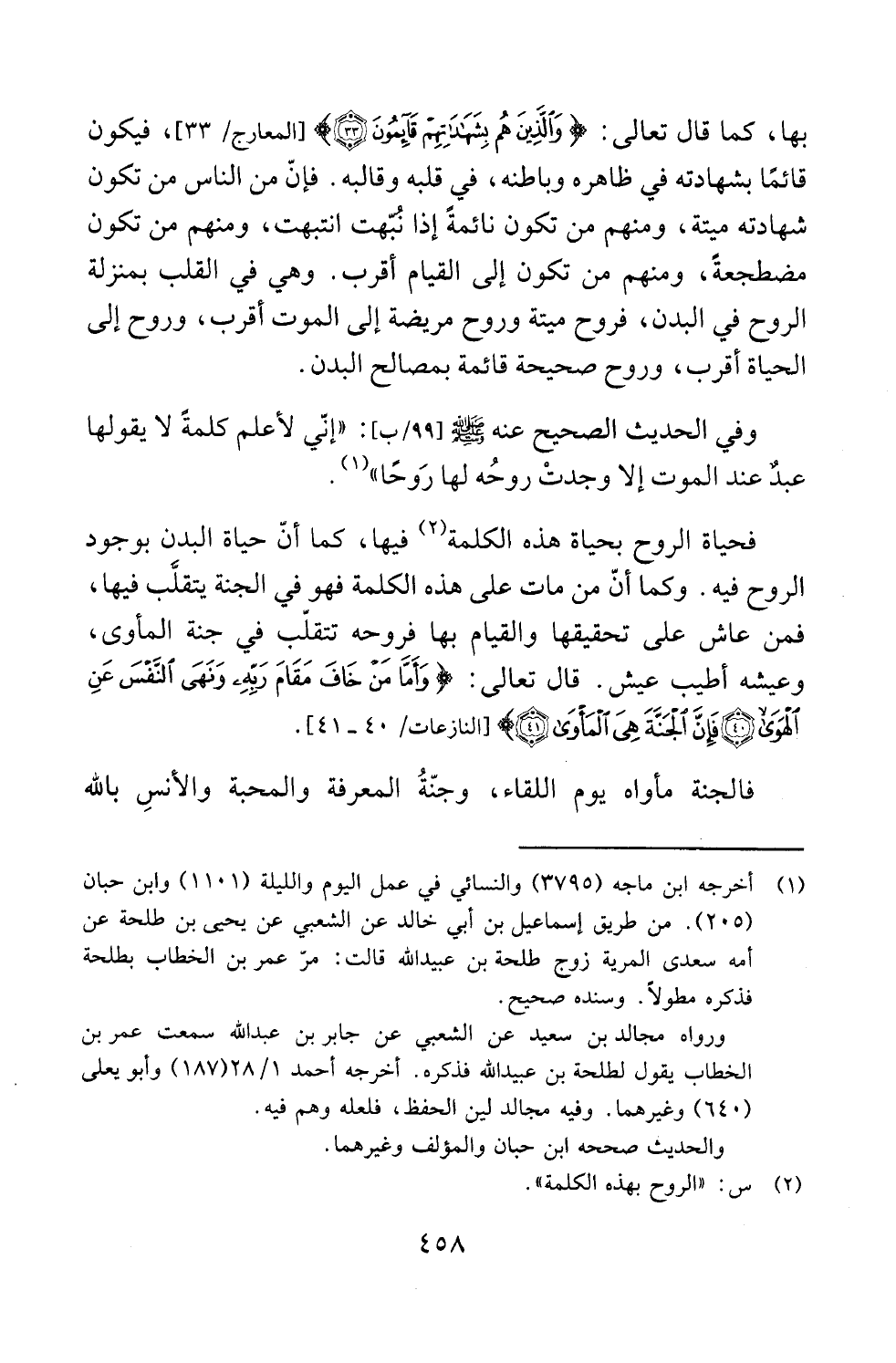 فحياة الروح بحياة هذه الكلمة (¬2) فيها، كما أنّ حياة البدن بوجود الروح فيه. وكما أنّ من مات على هذه الكلمة فهو في الجنّة يتقلَّب فيها، فمن عاش على تحقيقها والقيام بها فروِحه تتقلّب في جنة المأوى، وعيشه أطيب عيش. قال تعالى: {وَأَمَّا مَنْ خَافَ مَقَامَ رَبِّهِ وَنَهَى النَّفْسَ عَنِ الْهَوَى (40) فَإِنَّ الْجَنَّةَ هِيَ الْمَأْوَى (41)} [النازعات: 40، 41].
