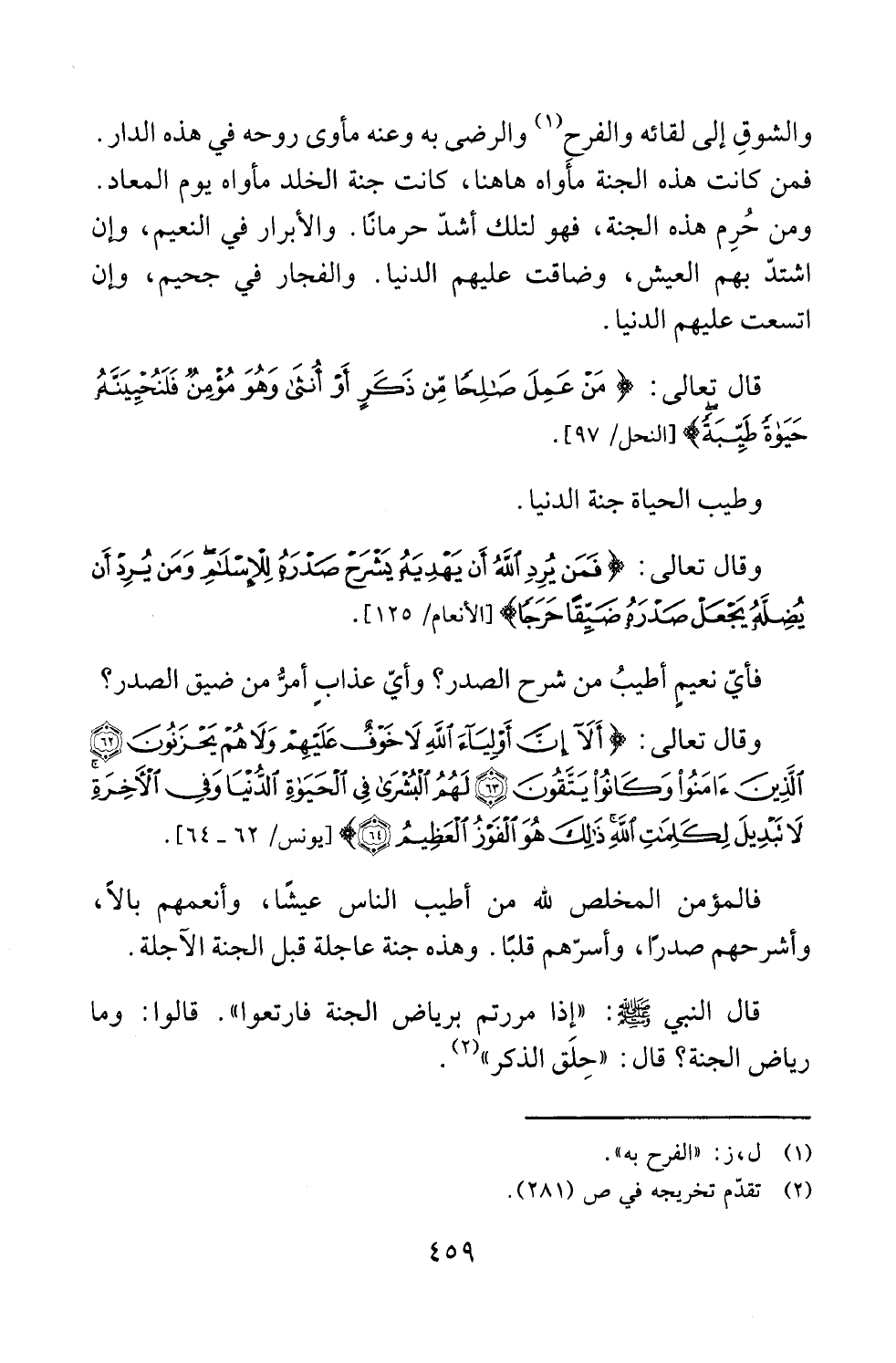 ومن حُرِم هذه الجنّة، فهو لتلك أشدّ حرمانًا. والأبرار في النعيم، وإن اشتدّ بهم العيش، وضاقت عليهم الدنيا. والفجار في جحيم، وإن اتسعت عليهم الدنيا.