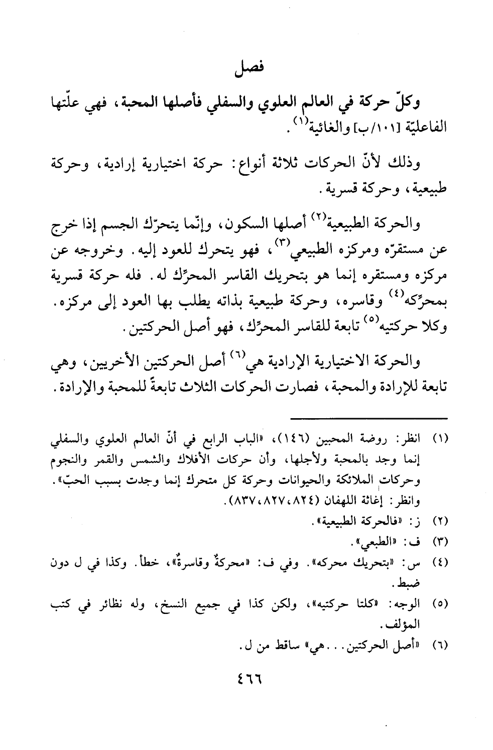 (¬1) انظر: روضة المحبين (146)، "الباب الرابع في أنّ العالم العلوي والسفلي إنما وجد بالمحبة ولأجلها، وأن حركات الأفلاك والشمس والقمر والنجوم وحركات االملائكة والحيوانات وحركة كل متحرك إنما وجدت بسبب الحبّ".