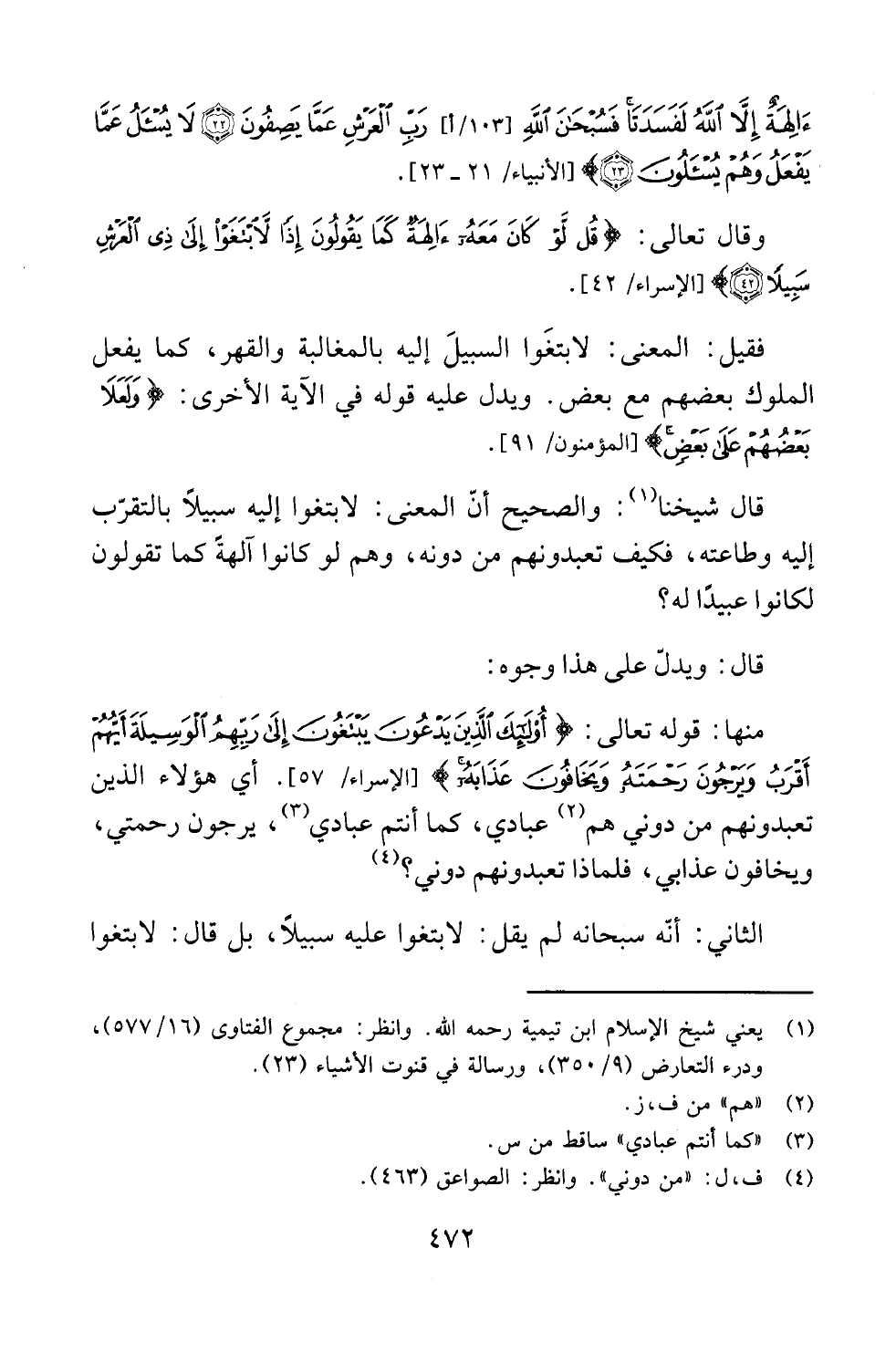 قال: ويدلّ على هذا وجوه: منها: قوله تعالي: {أُولَئِكَ الَّذِينَ يَدْعُونَ يَبْتَغُونَ إِلَى رَبِّهِمُ الْوَسِيلَةَ أَيُّهُمْ أَقْرَبُ وَيَرْجُونَ رَحْمَتَهُ وَيَخَافُونَ عَذَابَهُ إِنَّ عَذَابَ رَبِّكَ كَانَ مَحْذُورًا (57)} [الإسراء: 57]. أي هؤلاء الذين تعبد ونهم من دوني هم (¬2) عبادي، كما أنتم عبادي (¬3)، يرجون رحمتي، ويخافون عذابي، فلماذا تعبدونهم دوني؟ (¬4)