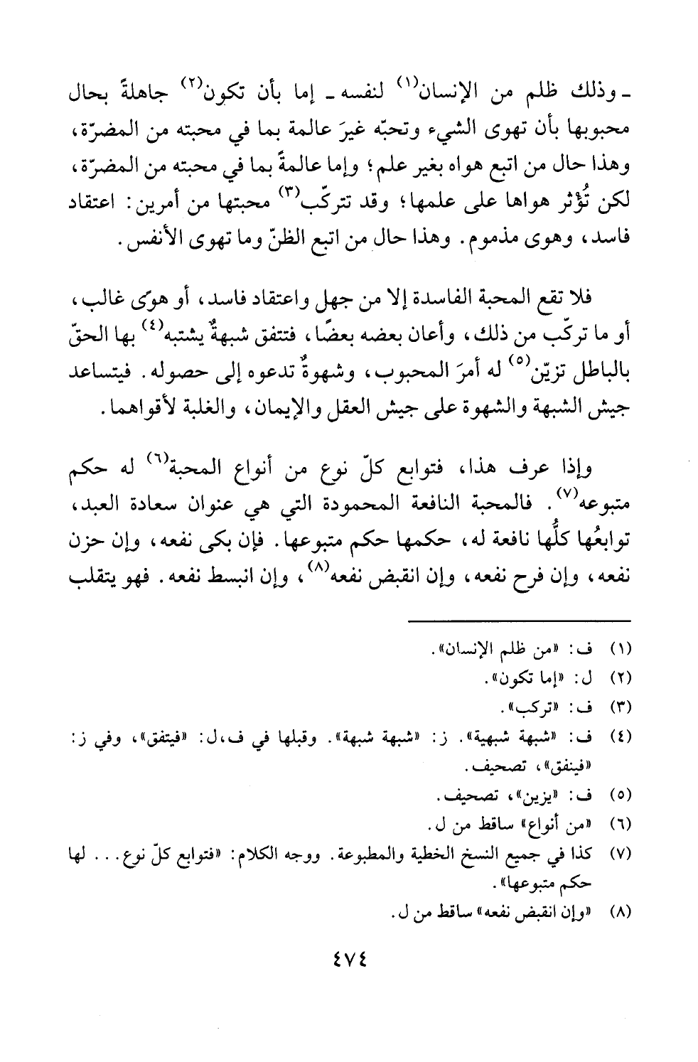 - وذلك ظلم من الإنسان (¬1) لنفسه- إما بأن تكون (¬2) جاهلةً بحال محبوبها بأن تهوى الشيء وتحبّه غيرَ عالمة بما في محبته من المضرّة، وهذا حال من أَتبع هواه بغير علم؛ وإما عالمةً بما في محبته من المضرّة،