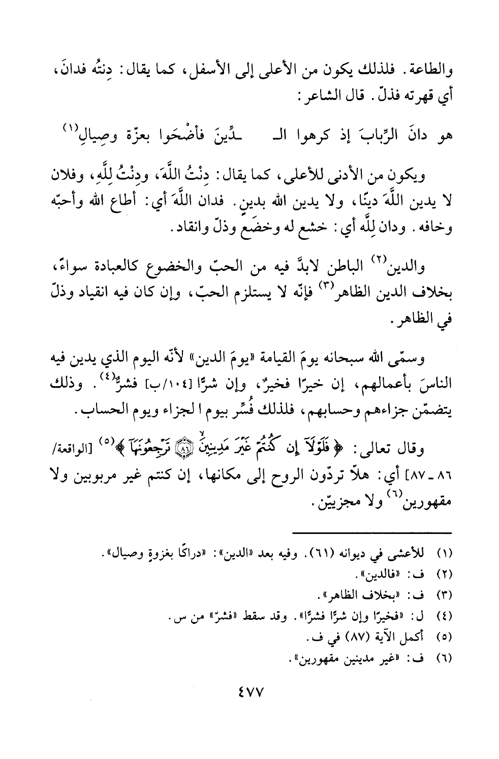 وقال تعالى: {فَلَوْلَا إِنْ كُنْتُمْ غَيْرَ مَدِينِينَ (86) تَرْجِعُونَهَا} (¬5) [الواقعة: 86، 87]، أي: هلاّ تردّون الروح إلى مكانها، إن كنتم غير مربوبين ولا مقهورين (¬6) ولا مجزييّن.