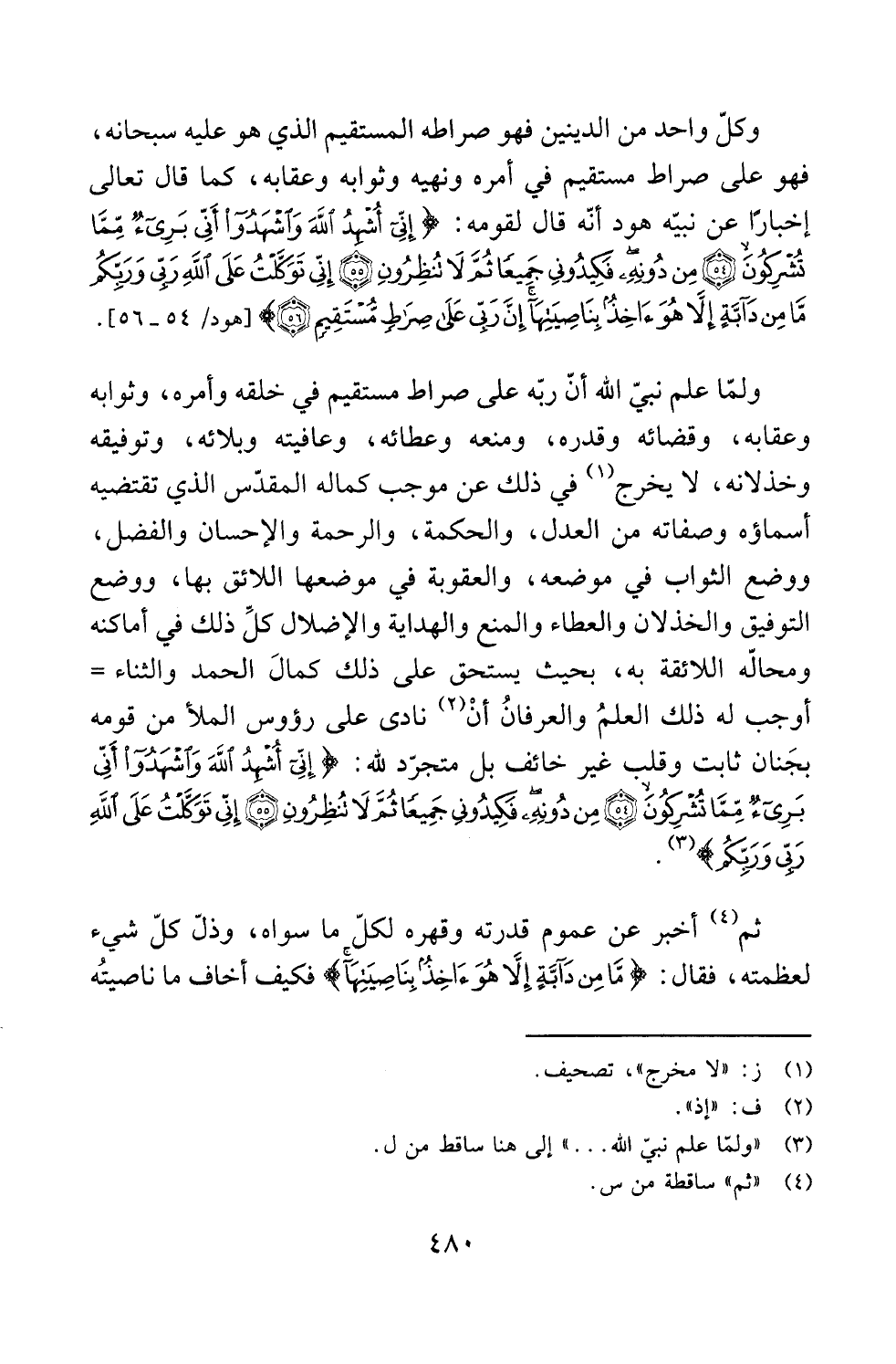 وكلّ واحد من الدينين فهو صراطه المستقيم الذي هو عليه سبحانه، فهو على صراط مستقيم في أمره ونهيه وثوابه وعقابه، كما قال تعالى إخبارَا عن نبيّه هود أنّه قال لقومه: {أُشْهِدُ اللَّهَ وَاشْهَدُوا أَنِّي بَرِيءٌ مِمَّا تُشْرِكُونَ (54) مِنْ دُونِهِ فَكِيدُونِي جَمِيعًا ثُمَّ لَا تُنْظِرُونِ (55) إِنِّي تَوَكَّلْتُ عَلَى اللَّهِ رَبِّي وَرَبِّكُمْ مَا مِنْ دَابَّةٍ إِلَّا هُوَ آخِذٌ بِنَاصِيَتِهَا إِنَّ رَبِّي عَلَى صِرَاطٍ مُسْتَقِيمٍ (56)} [هود: 54 - 56].