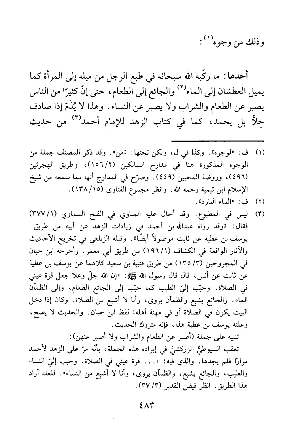 أحدها: ما ركّبه الله سبحانه في طبع الرجل من ميله إلى المرأة كما يميل العطشان إلى الماء (¬2) والجائع إلى الطعام، حتى إنّ كثيرًا من الناس يصبر عن الطعام والشراب ولا يصبر عن النساء. وهذا لا يُذَمّ إذا صادف حِلًّا بل يحمد، كما في كتاب الزهد للإمام أحمد (¬3) من حديث