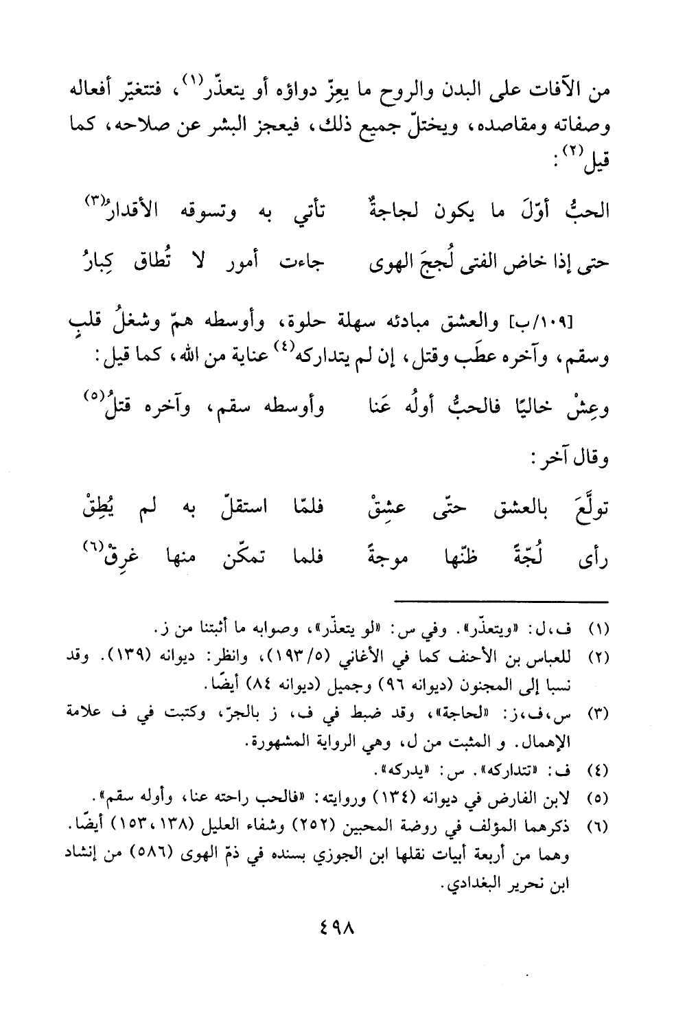 [109/ ب] والعشق مبادئه سهلة حلوة، وأوسطه همّ وشغلُ قلبِ وسقم، وآخره عطَب وقتل، إن لم يتداركه (¬4) عناية من الله، كما قيل: