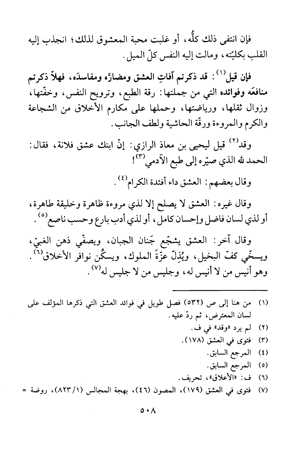 (¬1) من هنا إلى ص (532) فصل طويل في فوائد العشق التي ذكرها المؤلف على لسان المعترض، ثم ردّ عليه.