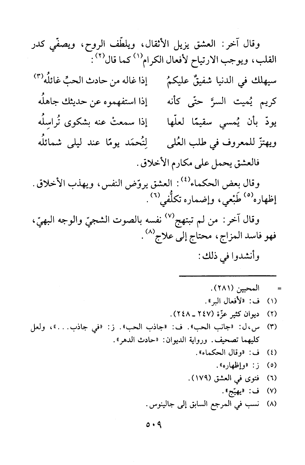 وقال آخر: العشق يزيل الأثقال، ويلطّف الروح، ويصفّي كدر القلب، ويوجب الارتياح لأفعال الكرام (¬1) كما قال (¬2):