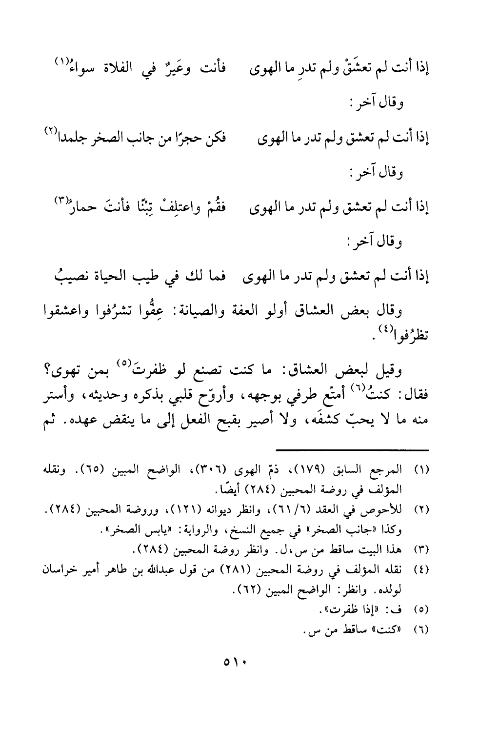 (¬1) المرجع السابق (179)، ذمّ الهوى (306)، الواضح المبين (65). ونقله المؤلف في روضة المحبين (284) أيضًا.