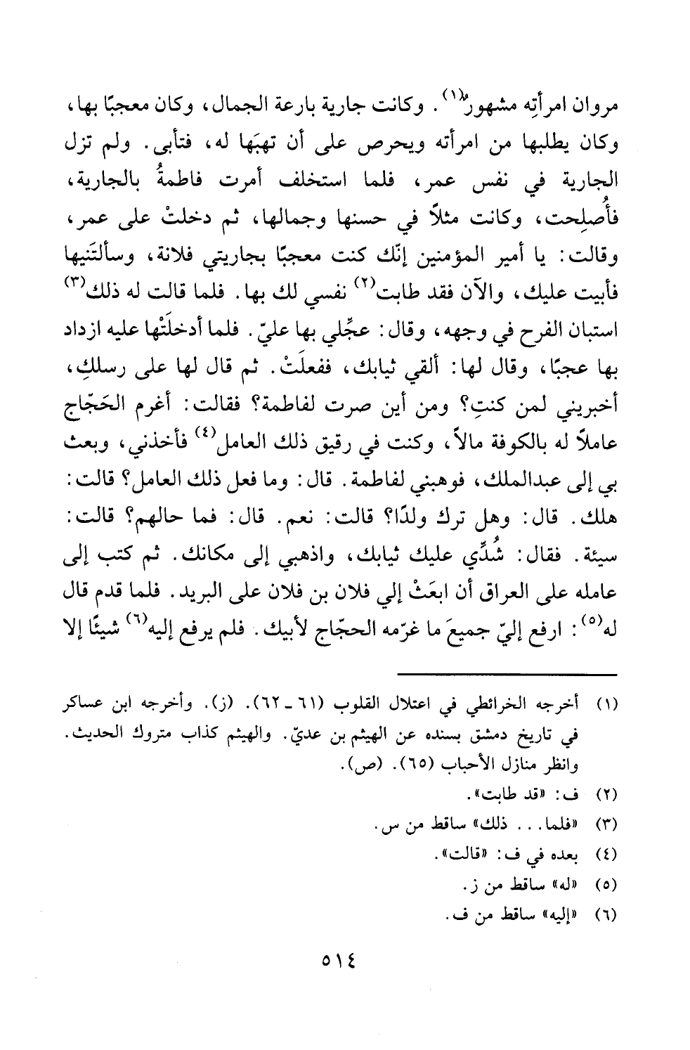 فأُصلِحت، وكانت مثلًا في حسنها وجمالها، ثم دخلتْ على عمر، وقالت: يا أمير المؤمنين إنّك كنت معجبًا بجاريتي فلانة، وسألتَنيها فأبيت عليك، والآن فقد طابت (¬2) نفسي لك بها. فلما قالت له ذلك (¬3) استبان الفرح في وجهه، وقال: عجَّلي بها عليّ. فلما أدخلَتْها عليه ازداد بها عجبًا، وقال لها: ألقي ثيابك، ففعلَتْ. ثم قال لها على رسلكِ، أخبريني لمن كنتِ؟ ومن أين صرت لفاطمة؟ فقالت: أغرم الحَجّاج عاملًا له بالكوفة مالًا، وكنت في رقيق ذلك العامل (¬4) فأخذني، وبعث بي إلى عبد الملك، فوهبني لفاطمة. قال: وما فعل ذلك العامل؟ قالت: هلك. قال: وهل ترك ولدا؟ قالت: نعم. قال: فما حالهم؟ قالت: سيئة. فقال: شُدِّي عليك ثيابك، واذهبي إلى مكانك. ثم كتب إلى عامله على العراق أن ابعَثْ إلى فلان بن فلان على البريد. فلما قدم قال له (¬5): ارفع إليّ جميعَ ما غرّمه الحجّاج لأبيك. فلم يرفع إليه (¬6) شيئًا إلا