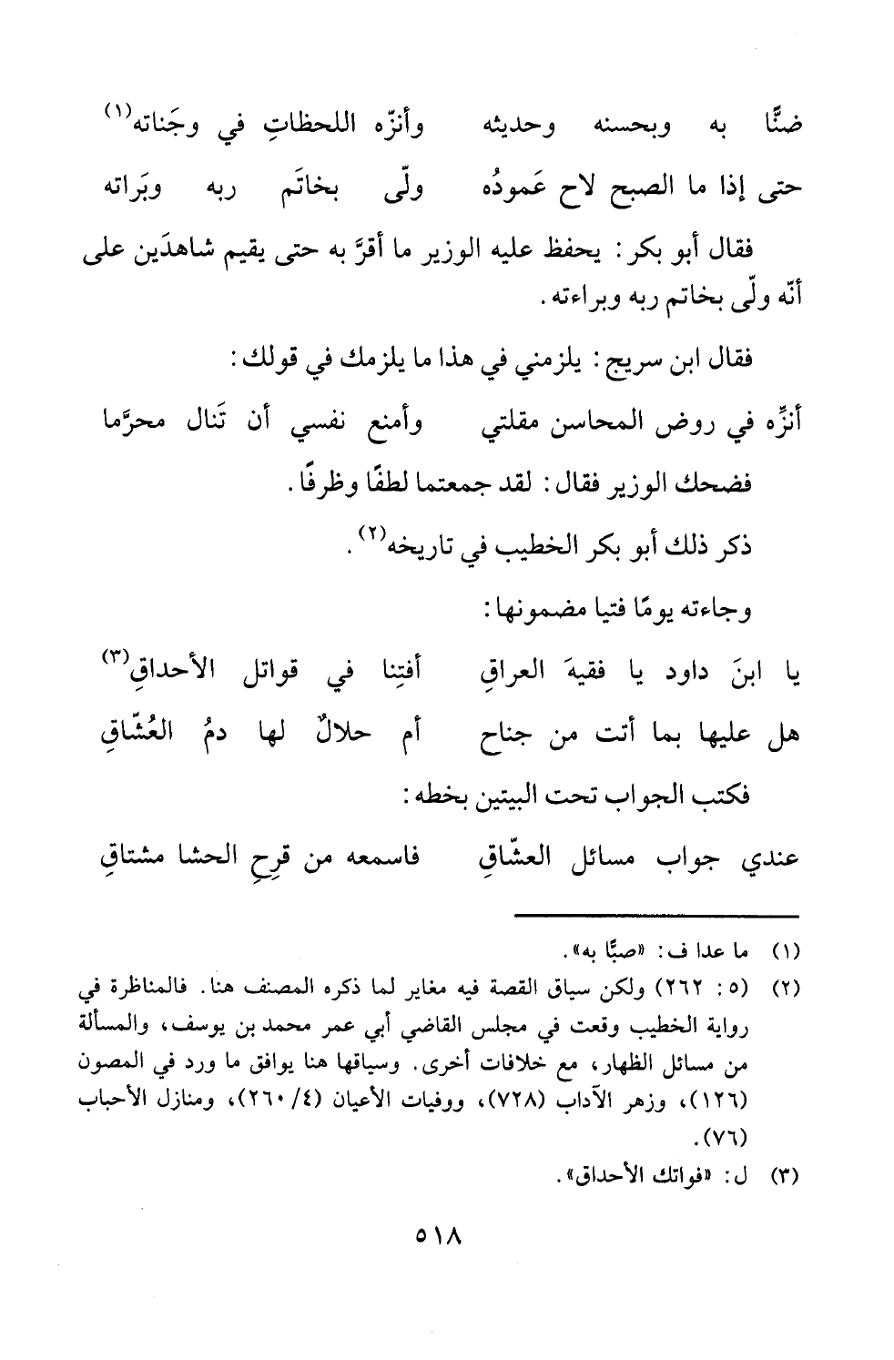 (¬2) (5: 262) ولكن سياق القصة فيه مغاير لما ذكره المصنف هنا. فالمناظرة في رواية الخطيب وقعت في مجلس القاضي أبي عمر محمَّد بن يوسف، والمسألة من مسائل الظهار، مع خلافات أخرى. وسياقها هنا يوافق ما ورد في المصون (126)، وزهر الآداب (728)، ووفيات الأعيان (4/ 260)، ومنازل الأحباب (76).