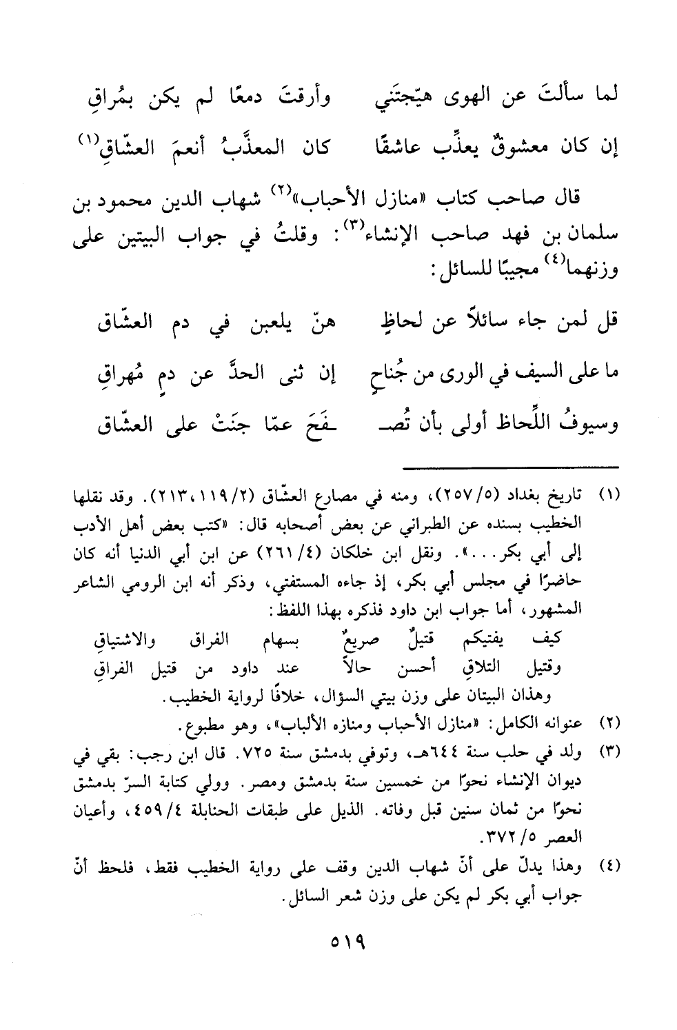 (¬4) وهذا يدلّ على أن شهاب الدين وقف على رواية الخطيب فقط، فلحظ أنّ جواب أبي بكر لم يكن على وزن شعر السائل.