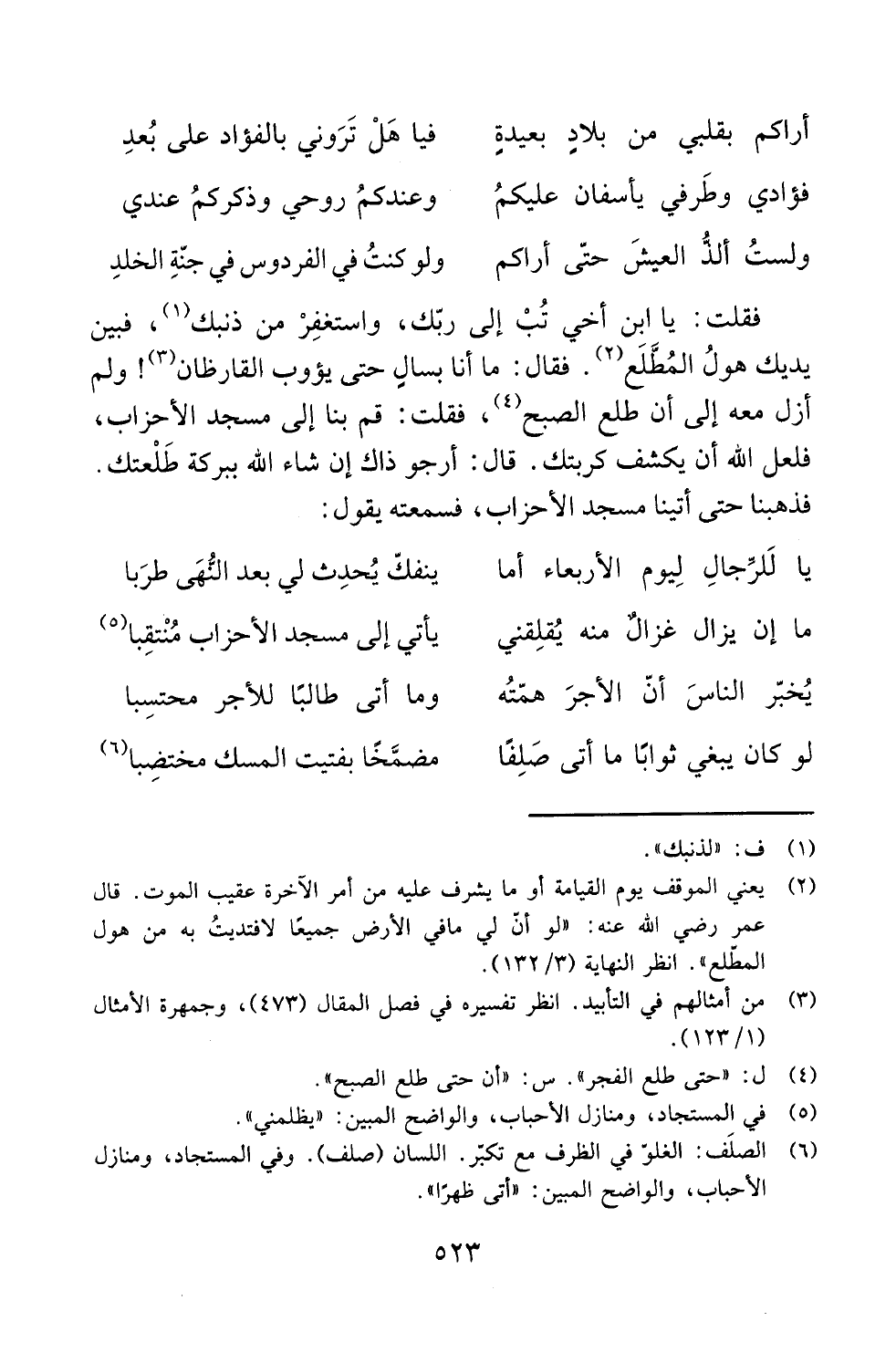 فقلت: يا ابن أخي تُبْ إلى ربّك، واستغفِرْ من ذنبك (¬1)، فبين يديك هولُ المُطَّلَع (¬2). فقال: ما أنا بسالٍ حتى يؤوب القارظان (¬3)! ولم أزل معه إلى أن طلع الصبح (¬4)، فقلت: قم بنا إلى مسجد الأحزاب، فلعل الله أن يكشف كربتك. قال: أرجو ذاك إن شاء الله ببركة طَلْعتك.