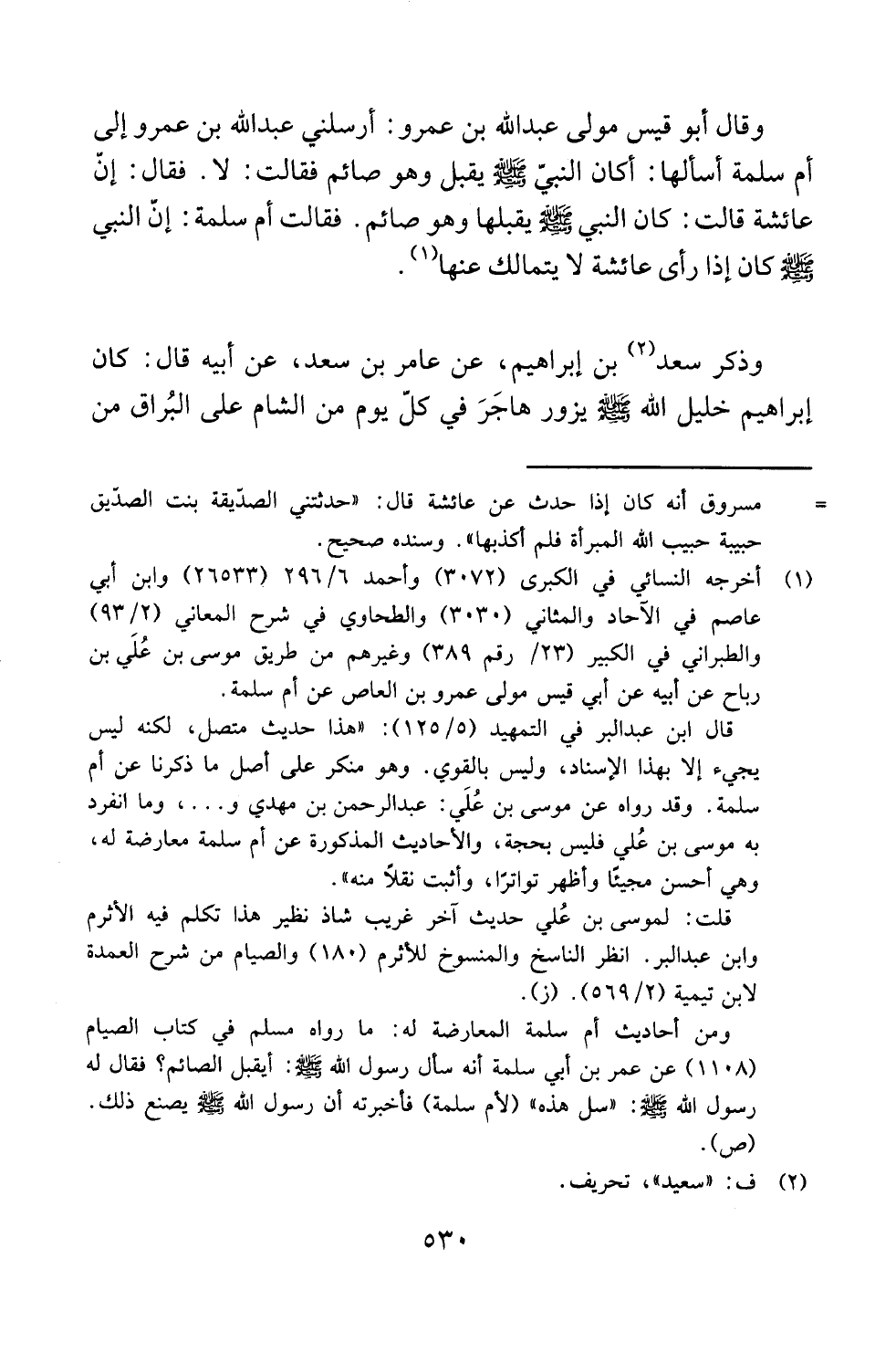وقال أبو قيس مولى عبد الله بن عمرو: أرسلني عبد الله بن عمرو إلى أم سلمة أسألها: أكان النبيّ - صلى الله عليه وسلم - يقبل وهو صائم فقالت: لا. فقال: إنّ عائشة قالت: كان النبي - صلى الله عليه وسلم - يقبلها وهو صائم. فقالت أم سلمة: إنّ النبي - صلى الله عليه وسلم - كان إذا رأى عائشة لا يتمالك عنها (¬1).