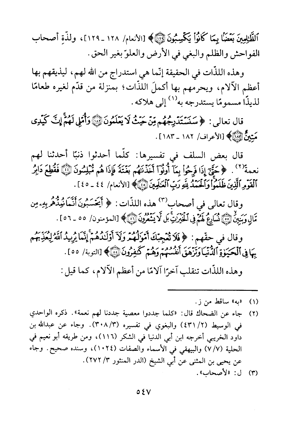وقال تعالى في أصحاب (¬3) هذه اللذّات: {أَيَحْسَبُونَ أَنَّمَا نُمِدُّهُمْ بِهِ مِنْ مَالٍ وَبَنِينَ (55) نُسَارِعُ لَهُمْ فِي الْخَيْرَاتِ بَلْ لَا يَشْعُرُونَ (56)} [المؤمنون: 55، 56].