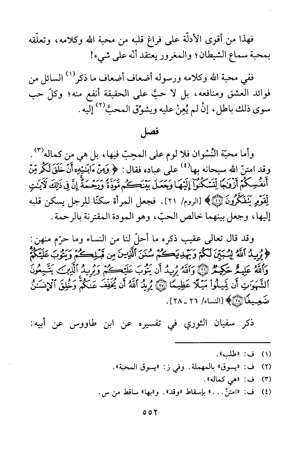 وأما محبّة النِّسْوان فلا لوم على المحِبّ فيها، بل هي من كماله (¬3).