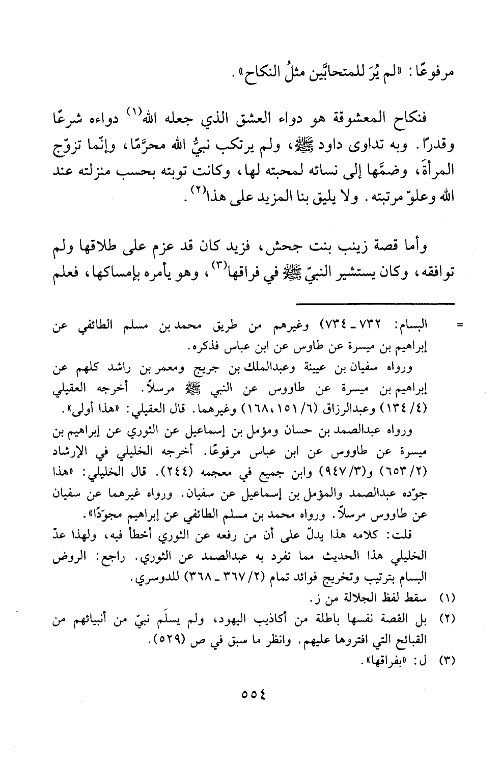 فنكاح المعشوقة هو دواء العشق الذي جعله الله (¬1) دواءه شرعًا وقدرًا. وبه تداوى داود - صلى الله عليه وسلم -، ولم يرتكب نبي الله مرَّمًا، وإنّما تزوّج المرأةَ، وضمَّها إلى نسائه لمحبته لها، وكانت توبته بحسب منزلته عند الله وعلؤ مرتبته. ولا يليق بنا المزيد على هذا (¬2).